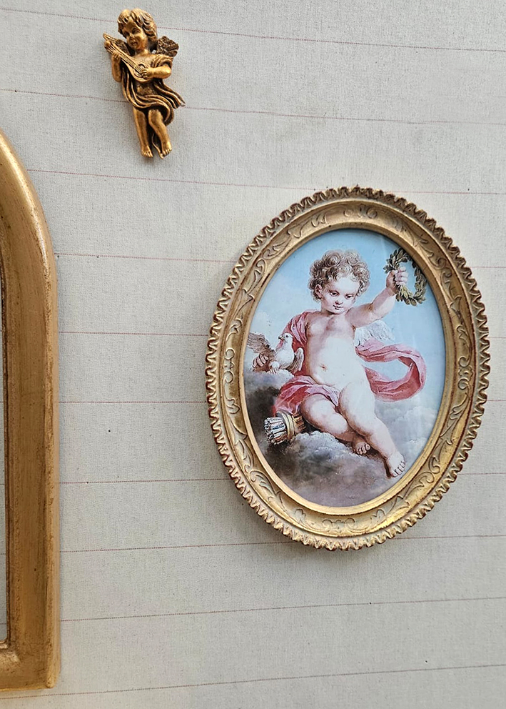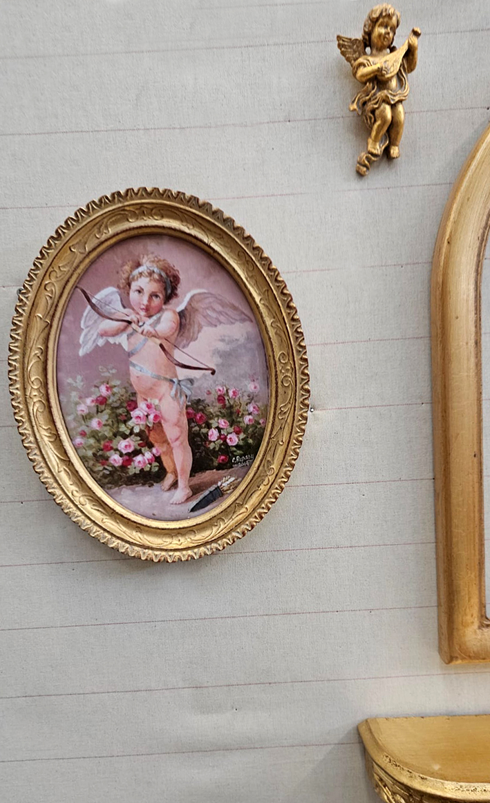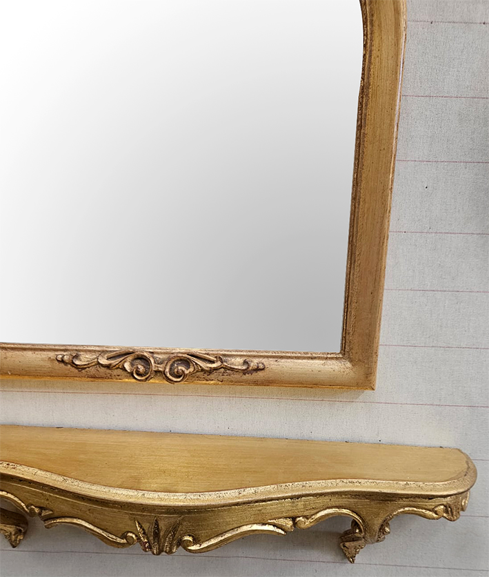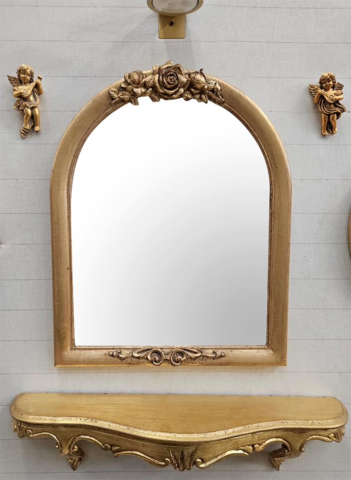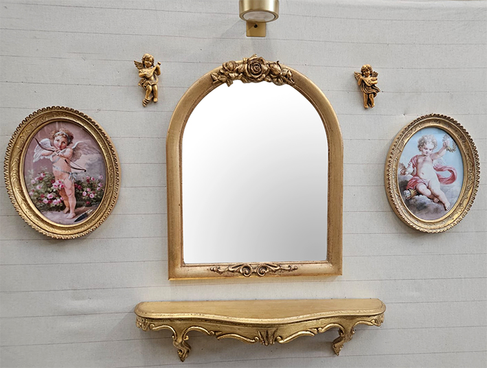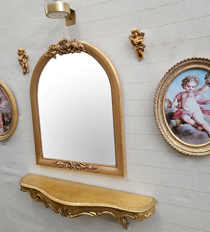 Completo da ingresso composto da specchio con cornice in legno oro foglia cm 50×41 misura esterna, su mensola in legno sagomata oro foglia cm 59x14x11, da coppia di cornici ovali con stampe di puttini con 2 puttini in resina.