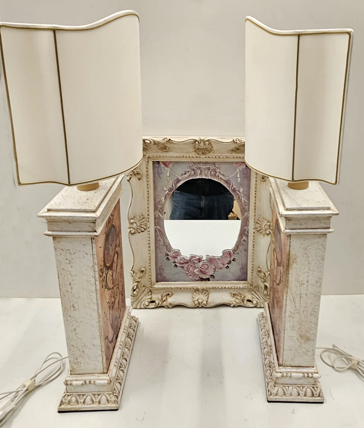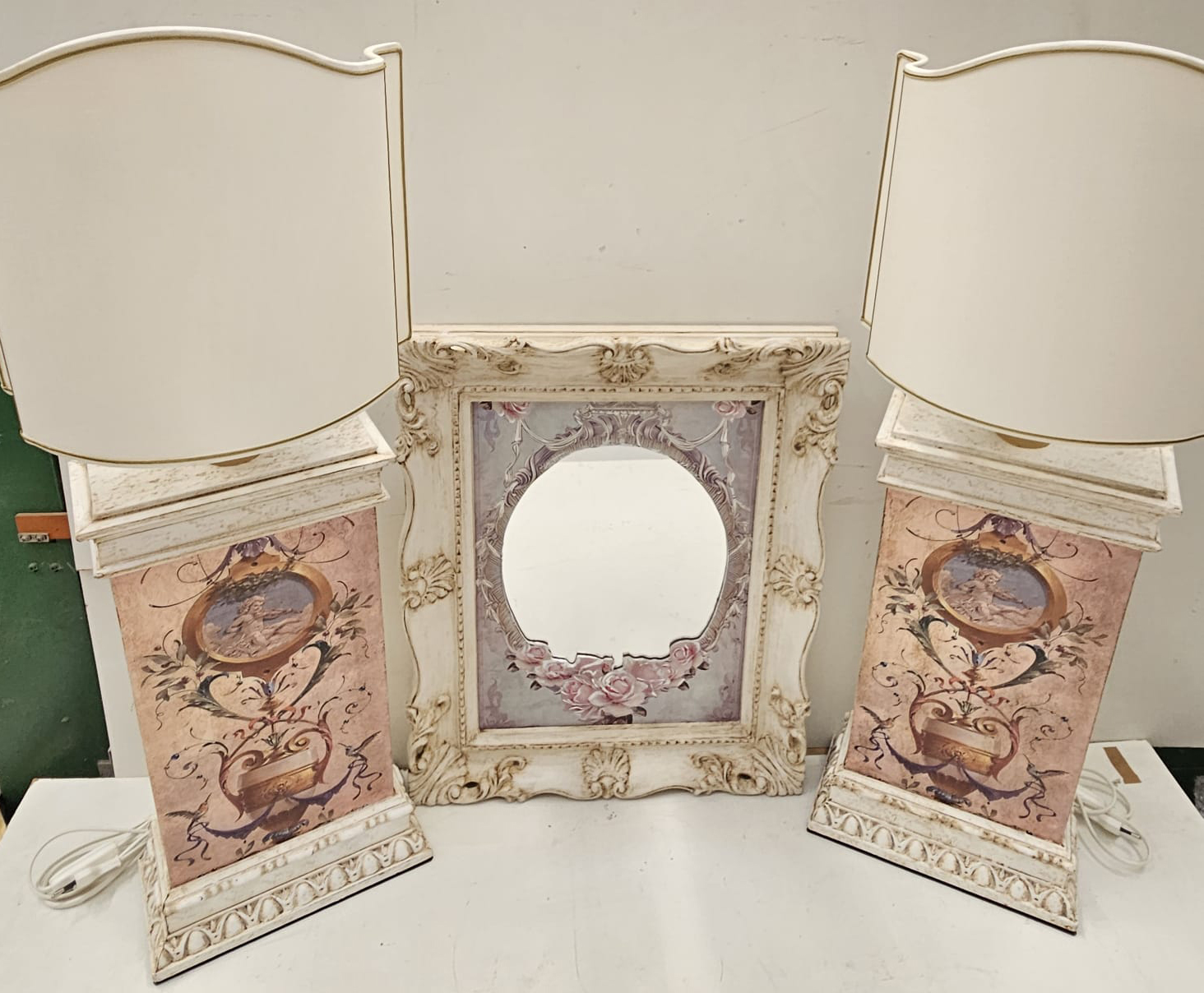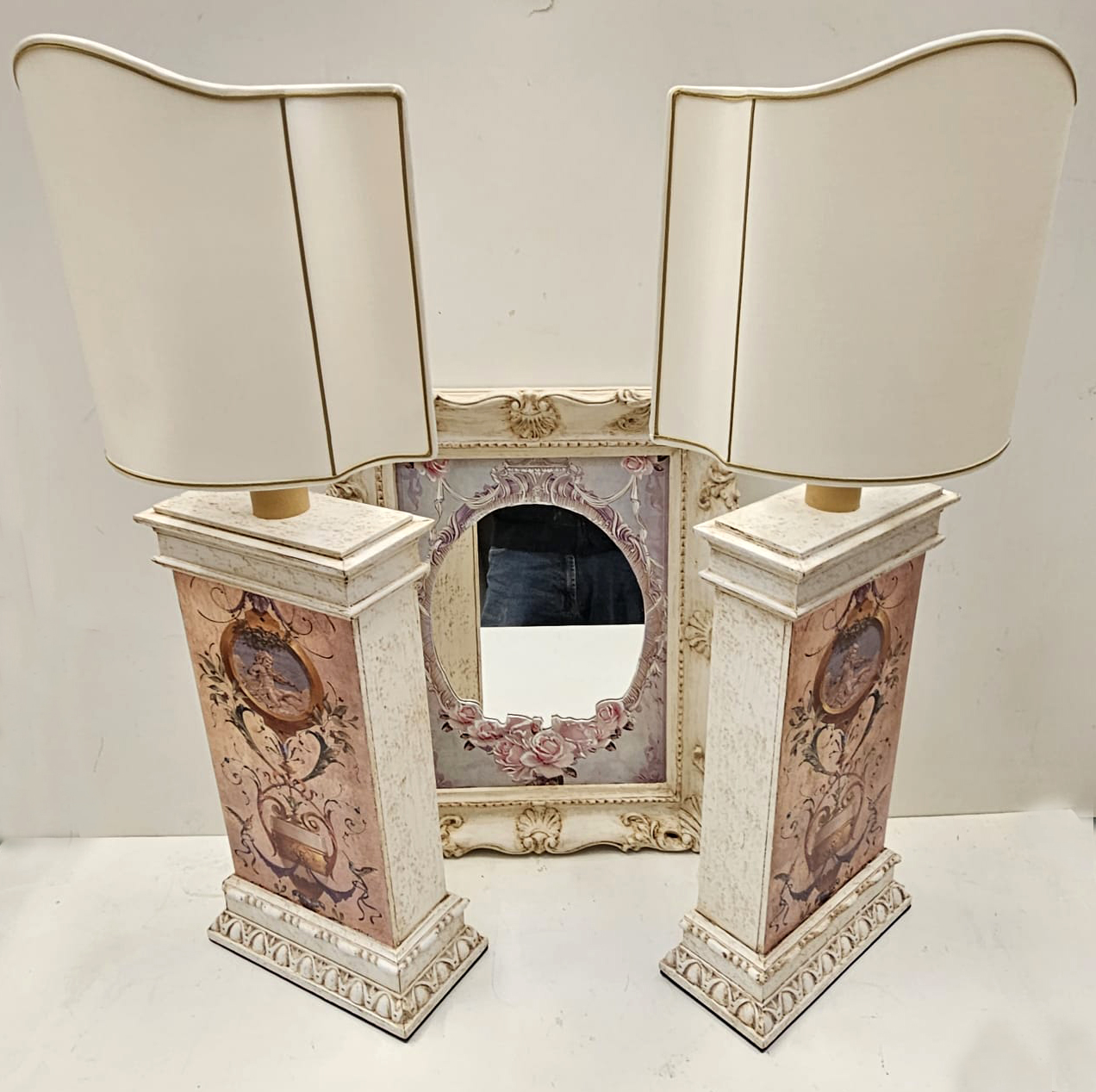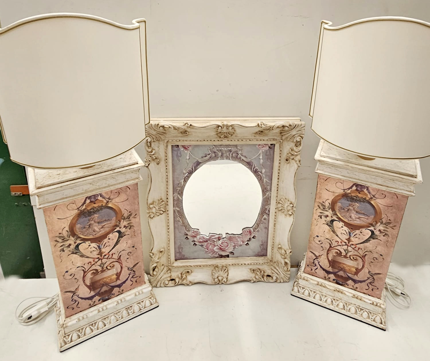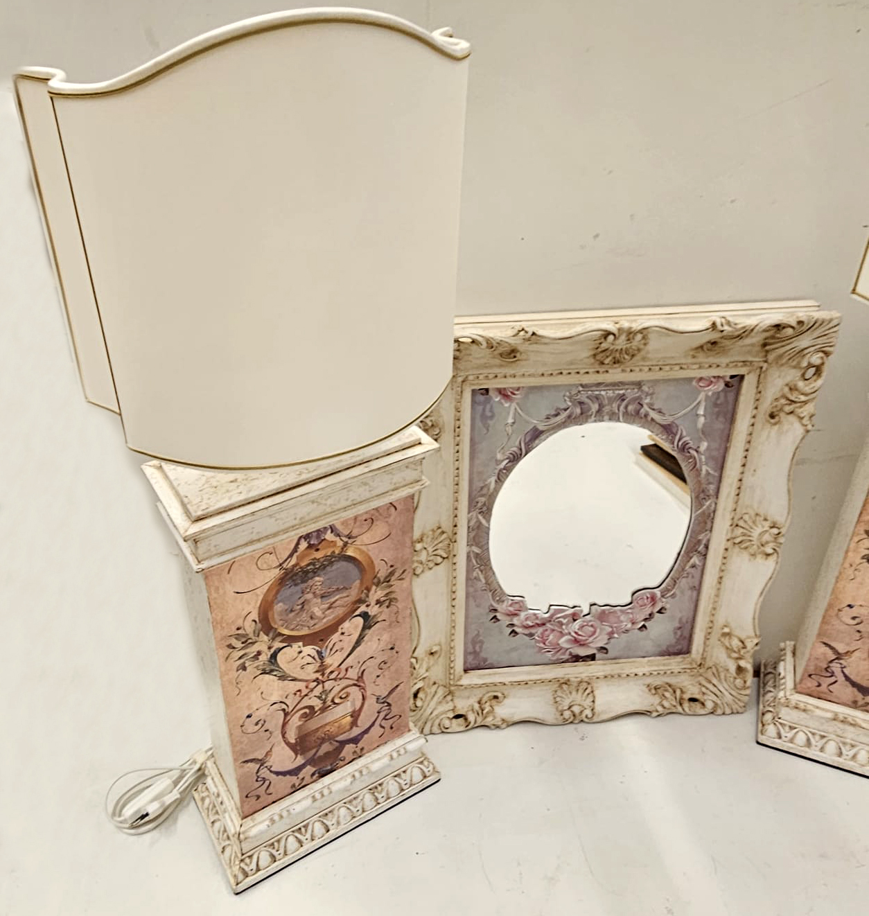 Set composto da 2 lampade da tavolo in legno stile provenzale con decoro simil dipinto a mano, con ventole sagomate, la base misura cm 46x25x12; più specchio da parete con cornice in legno stile provenzale, cm 30×40 misura interna e cm 40×50 misura esterna.