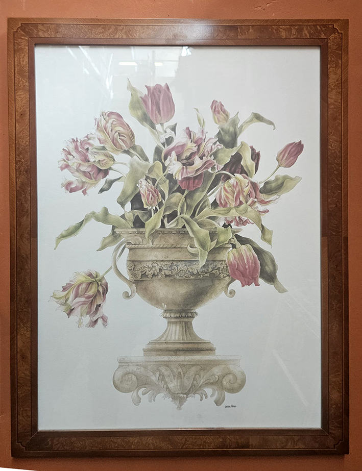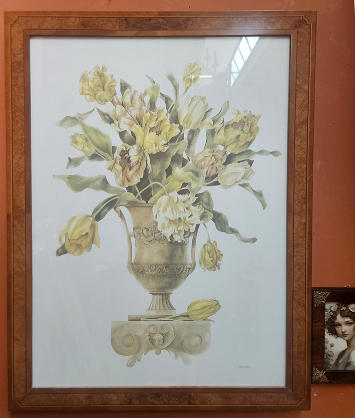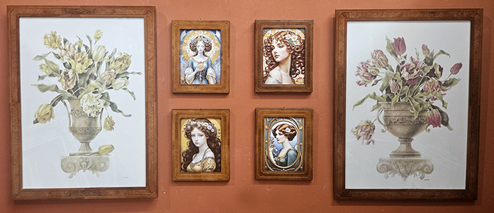 Stock di 2 stampe colorate a mano in cornici in legno intarsiate a mano cm 50×70 e di 4 stampe di dame dell’800 in cornici intarsiate a mano cm 18×24.