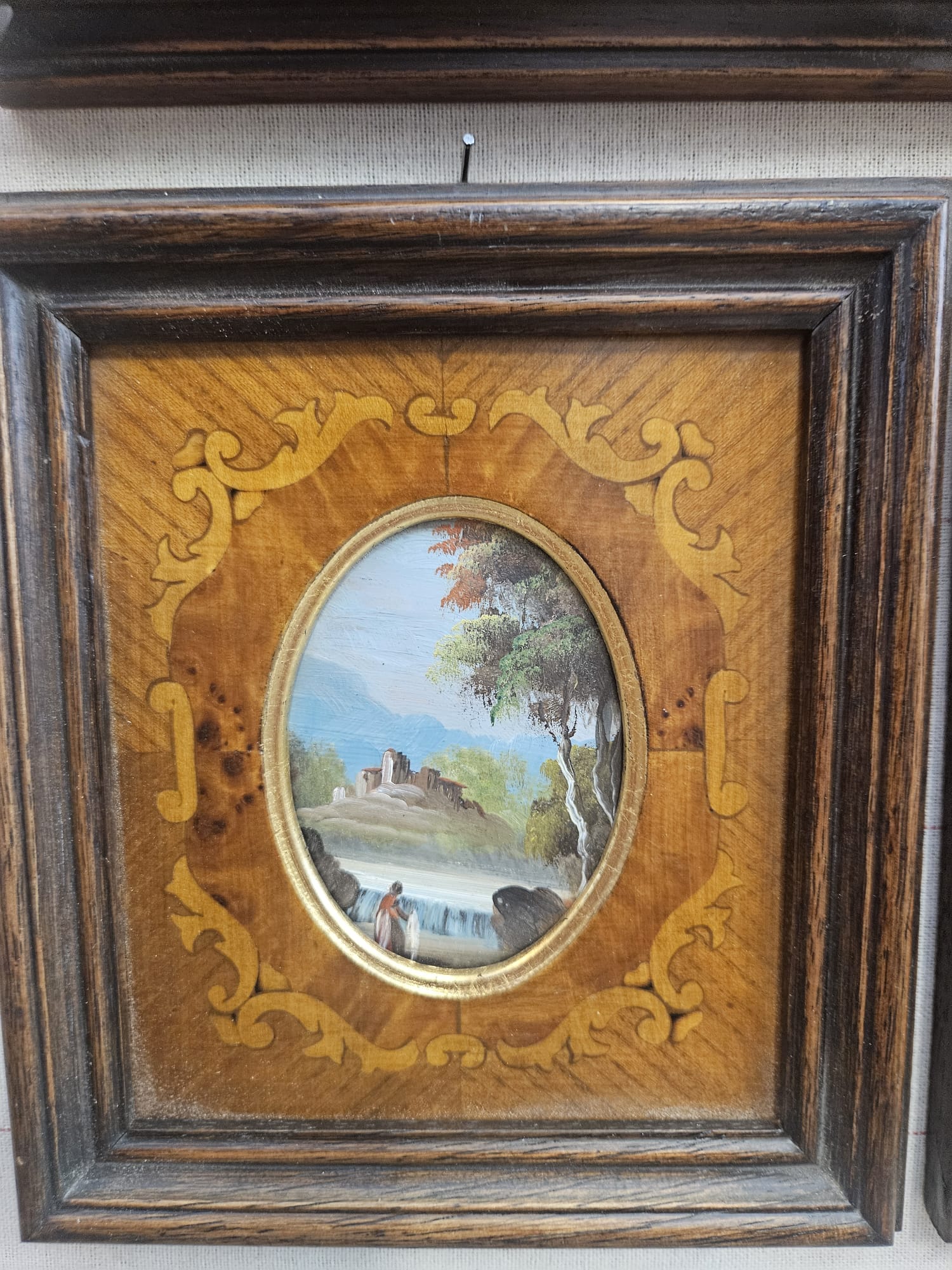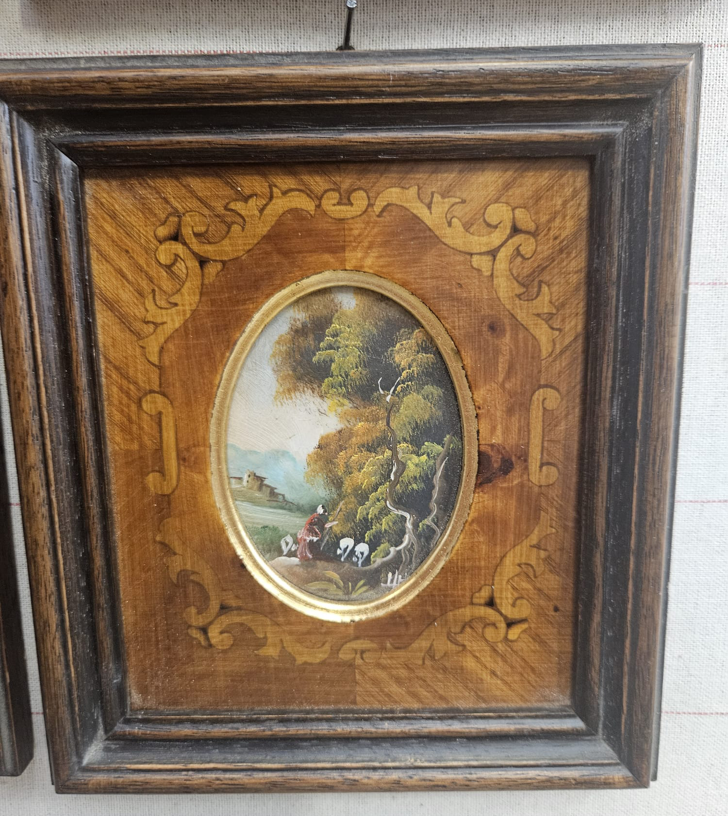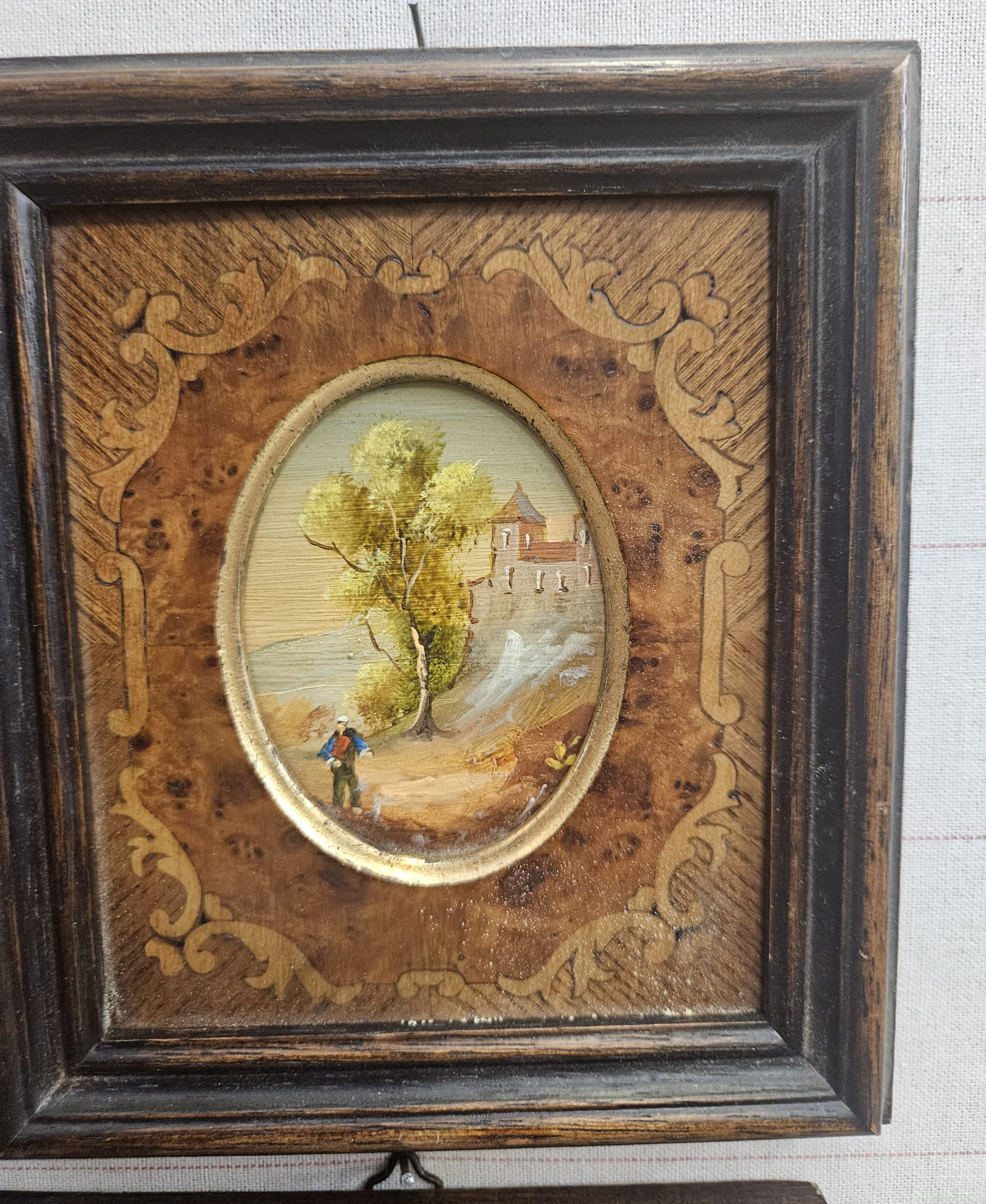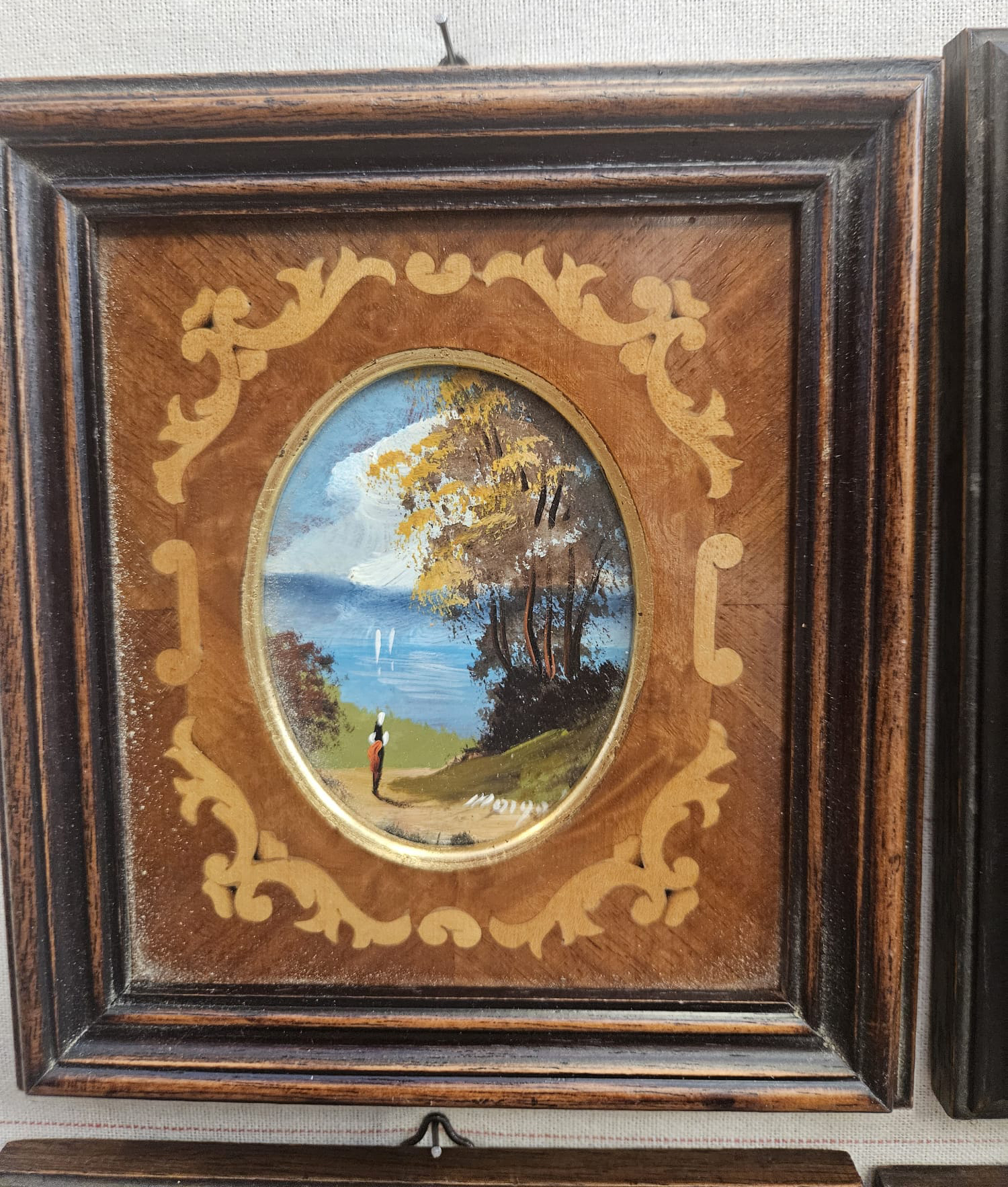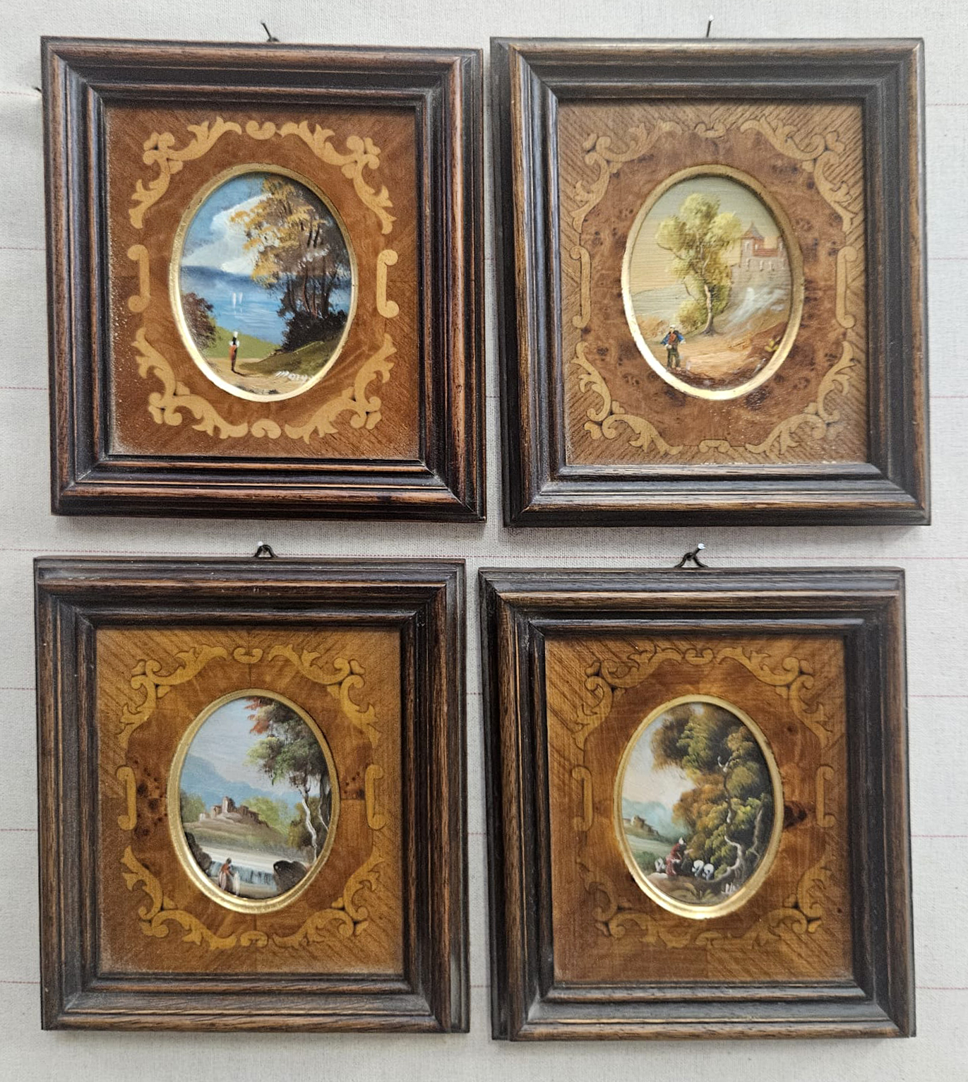 4 dipinti ad olio su rame soggetto paesaggi, in cornici in legno finemente intarsiate a mano, cm 7×9 misura interna e cm 15×17 misura esterna.