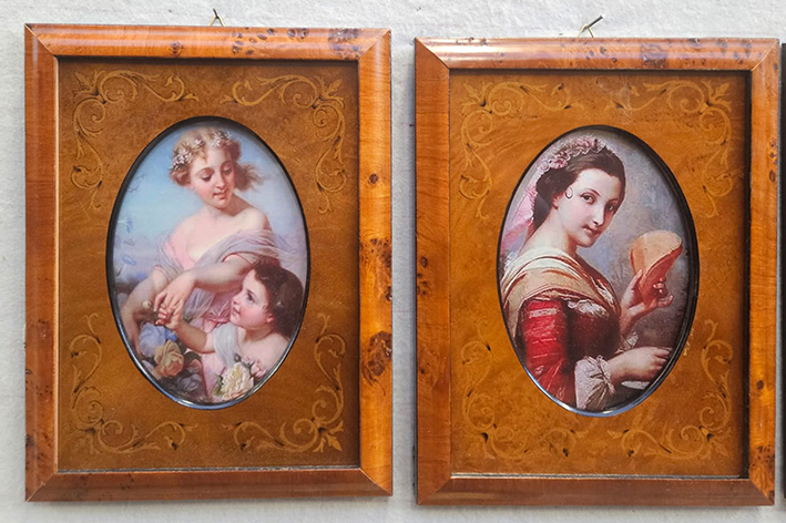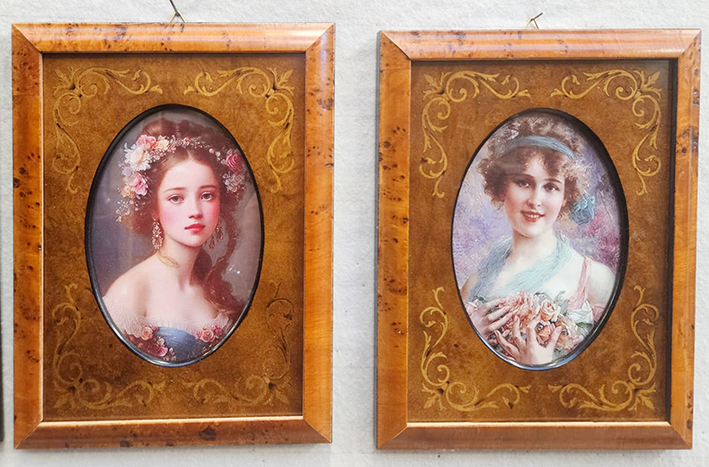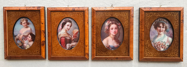Serie di 4 stampe di dame in cornice in radica con passepartout intarsiato cm 13×18 misura interna e cm 18×24 misura esterna.