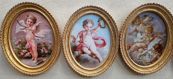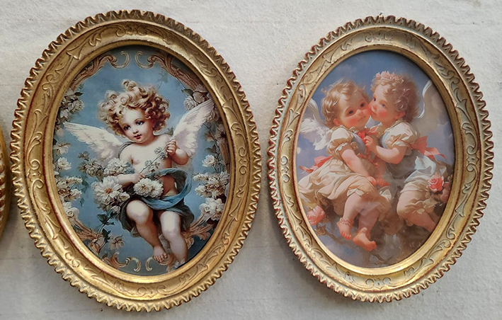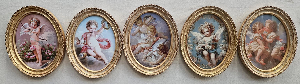 Serie di 5 stampe di puttini in cornici in legno colore oro, con vetro, cm 18×24 misura interna.