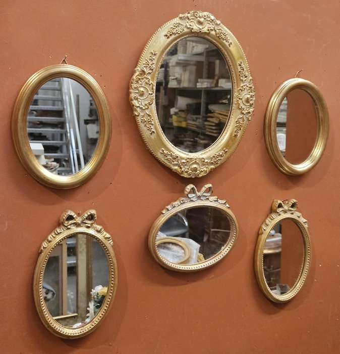Serie di 6 specchietti da arredamento in legno e pastiglia oro foglia. 5 pezzi cm 13×18 e uno cm 18×24.
