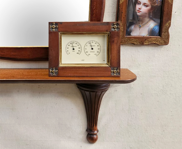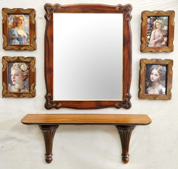 Completo da parete composto da specchio in legno con cornice sagomata arte povera noce a cera ed incisa negli angoli, da 4 quadretti con fanciulle cm 13×18 misura interna e da mensola in legno ciliegio cm 70x13x30.