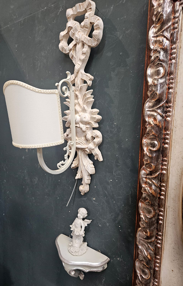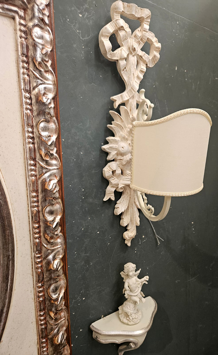 Completo composto da specchio da parete con cornice in legno colore bianco provenzale e foglia argento puro, cm 50×70 misura interna; da coppia di applique in legno colore bianco provenzale con ventola, da due mensoline in legno con statuine di puttini in resina e da fregio decorativo.