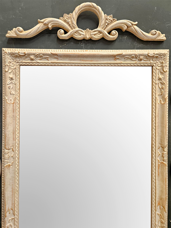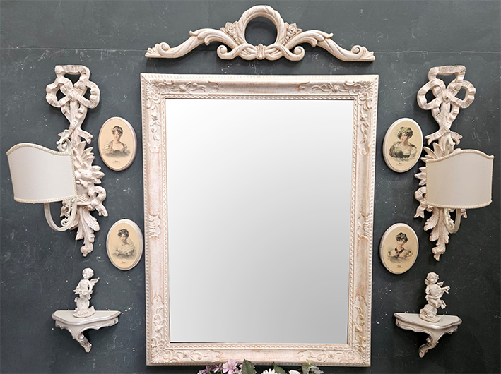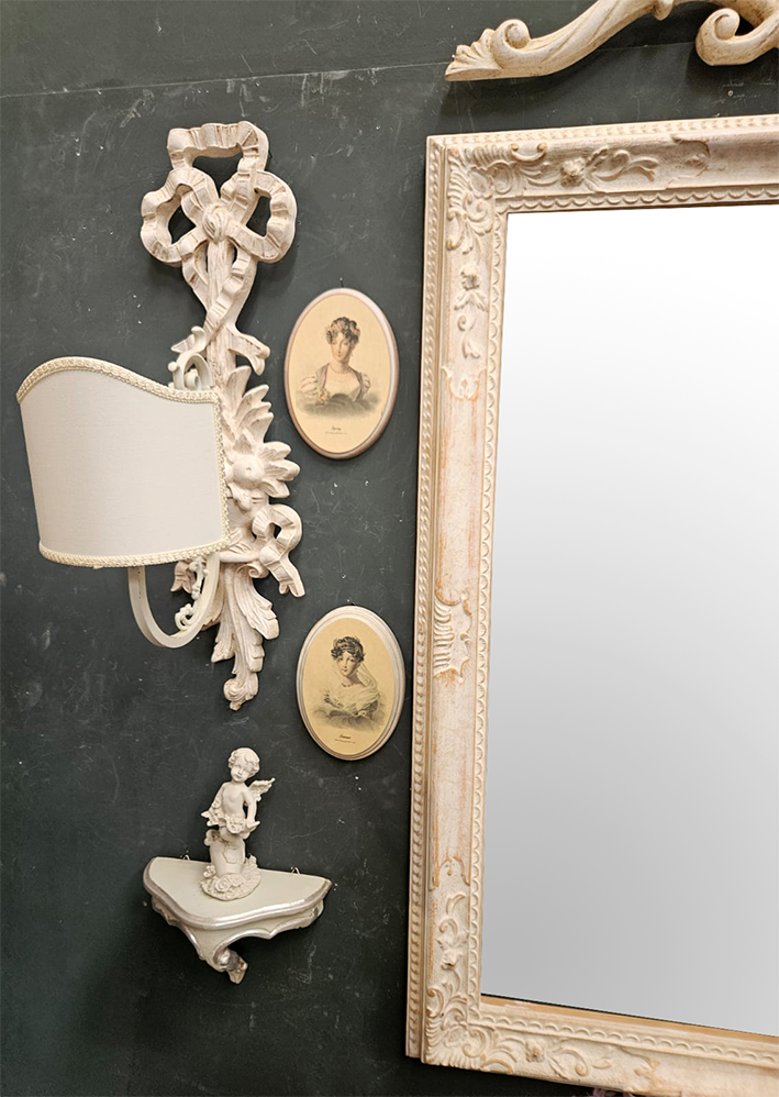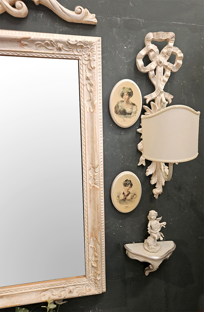 Completo composto da specchio da parete con cornice in legno colore bianco provenzale, cm 60×80 misura interna; da coppia di applique in legno pastellato con ventola, da due mensoline in legno con statuine di puttini in resina, da 4 damine su pannello ovale cm 10×15 e da fregio decorativo.