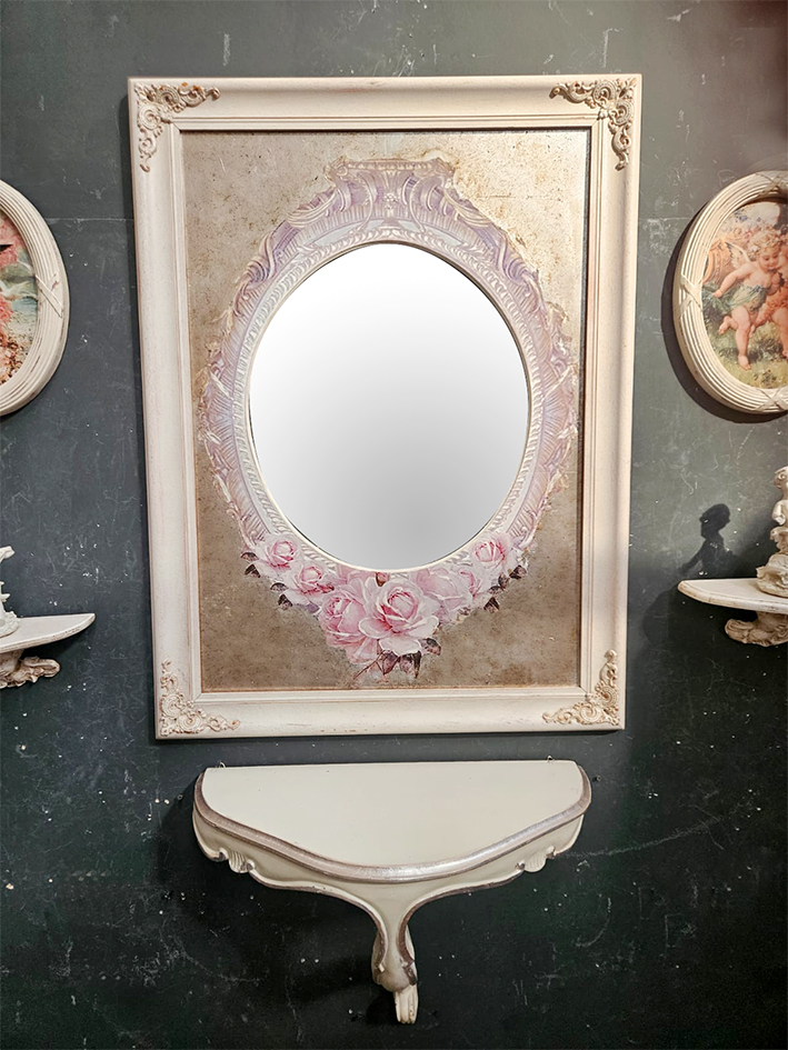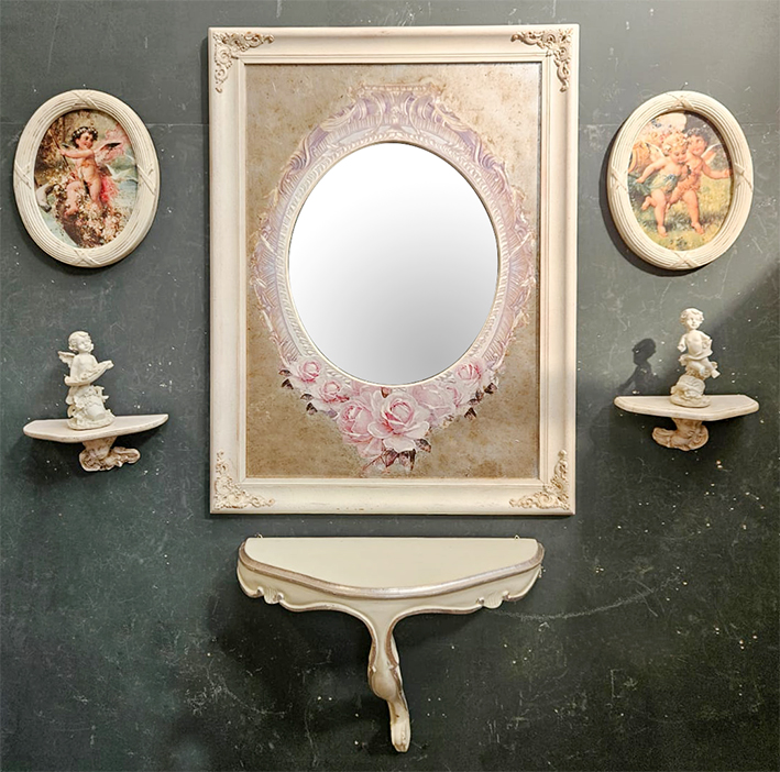 Completo composto da specchio da parete con cornice in legno colore bianco provenzale, con passepartout floreale e foglia argento, cm 55×75 misura esterna e cm 35×40 misura specchio, da 2 stampe di puttini ritoccate cm 18×24, da 2 mensoline cm 23x12x7 con puttini in resina e da consolle in legno bianca e argento cm 43x21x33.
