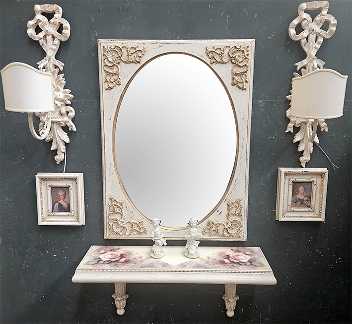 Completo composto da specchio con cornice in legno colore bianco Provenzale, cm 50x70 misura interna e cm 60x80 misura esterna, da 2 applique in legno con ventole, da 2 miniature cm 9x12 e da mensola con stampa floreale cm 76x21x32. Statuine di angiolini in resina comprese.