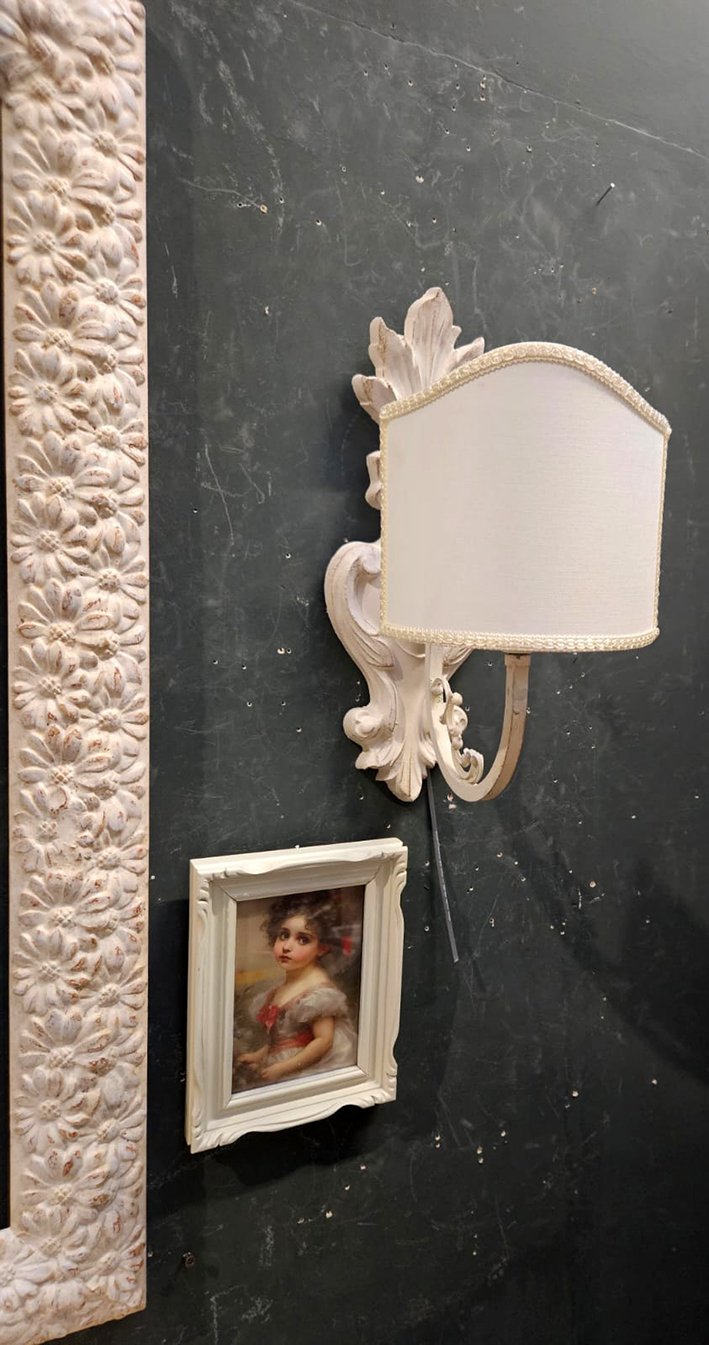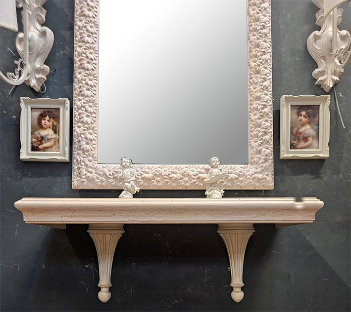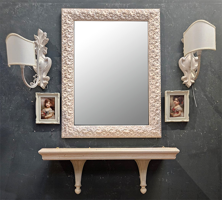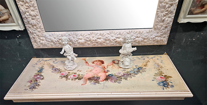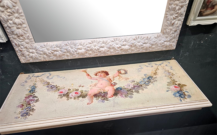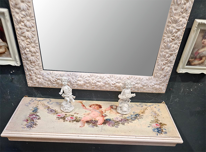 Completo composto da specchiera in legno con con cornice floreale colore bianco provenzale cm 50×70 misura interna, da mensola in legno decorata con puttino cm 72x18x23, da coppia di applique con ventole alte cm 35 e da coppia di miniature cm 10×15.