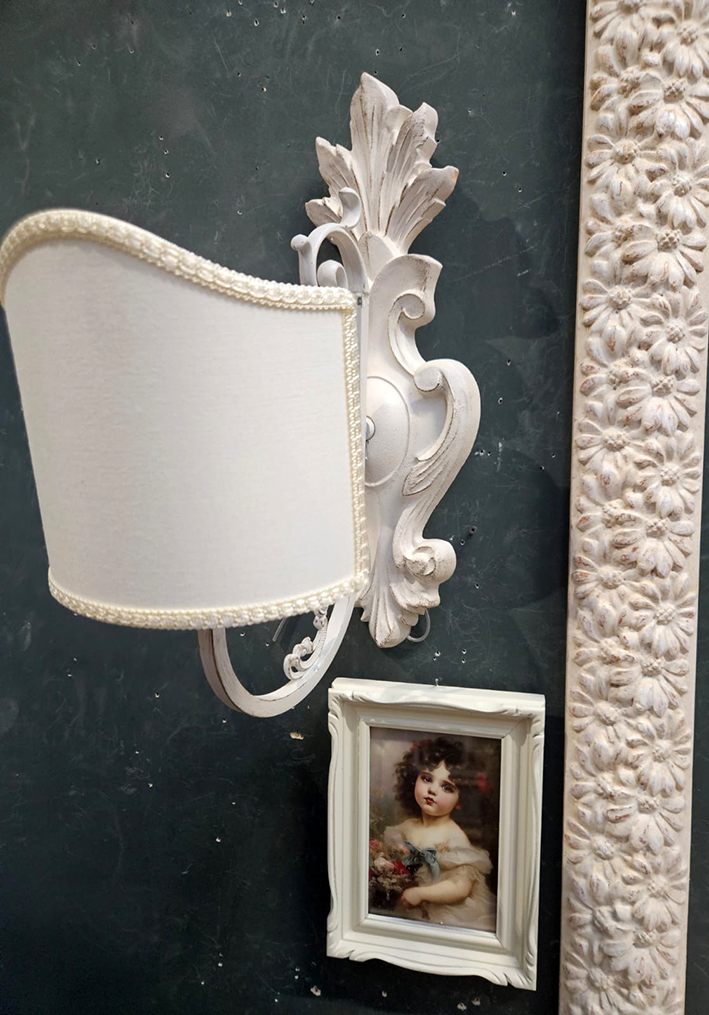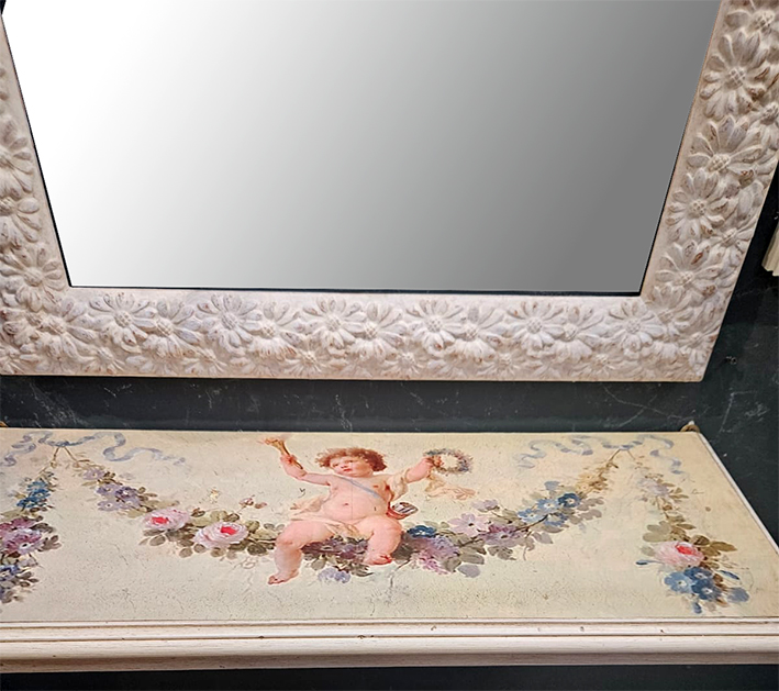 Completo composto da specchiera in legno con con cornice floreale colore bianco provenzale cm 50x70 misura interna, da mensola in legno decorata con puttino cm 72x18x23, da coppia di applique con ventole alte cm 35 e da coppia di miniature cm 10x15.