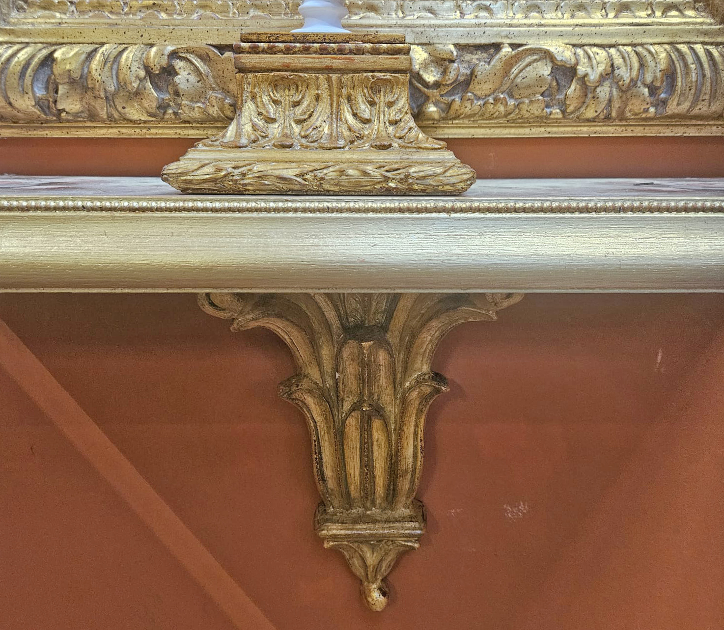 Completo composto da specchio con cornice in legno jelutong interamente intagliata a mano cm 50×70 misura interna e cm 78×98 misura esterna, con mensola in legno oro foglia cm 70x24x15, applique in legno a doppia fiamma con ventole e stampe in cornici in legno oro vittoriane cm 13×18.