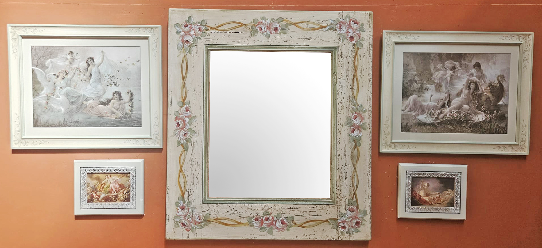 Completo da parete composto da specchiera in legno vero autentico antico dipinto a mano cm 50x60 misura interna e cm 80x90 misura esterna, da 2 stampe incisioni colorate a mano allegorie primaverili in cornici in legno dipinte a mano cm 40x50 interno e da due simildipinti di scende settecentesche cm 13x18.