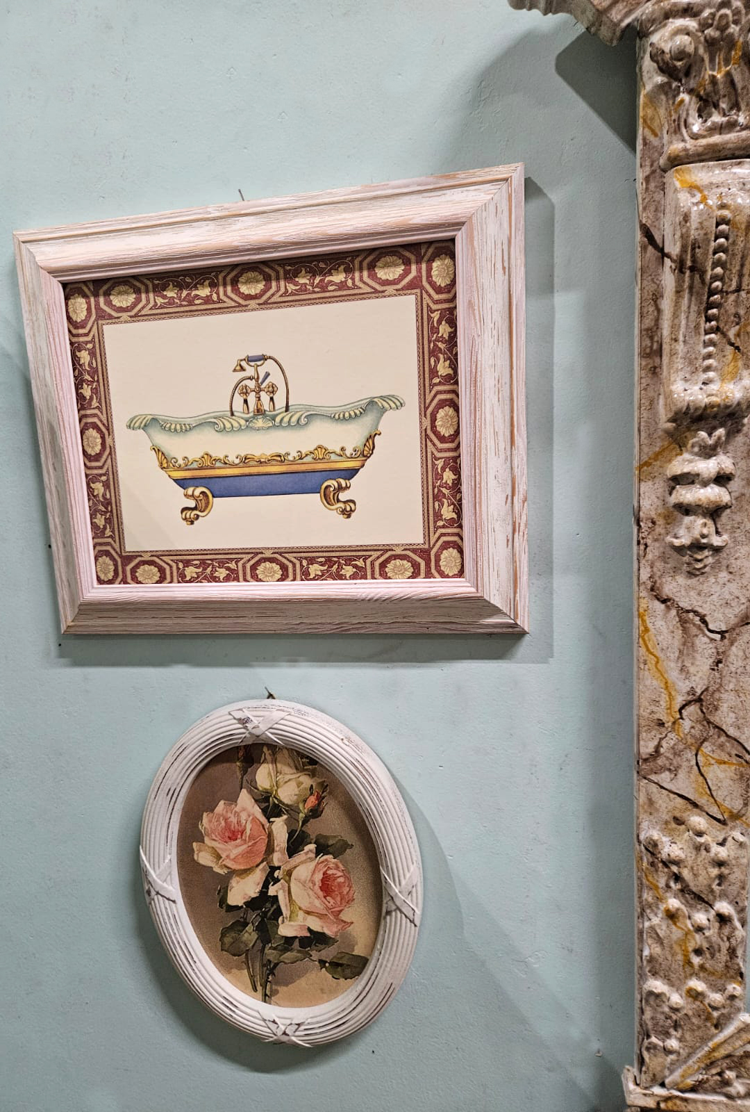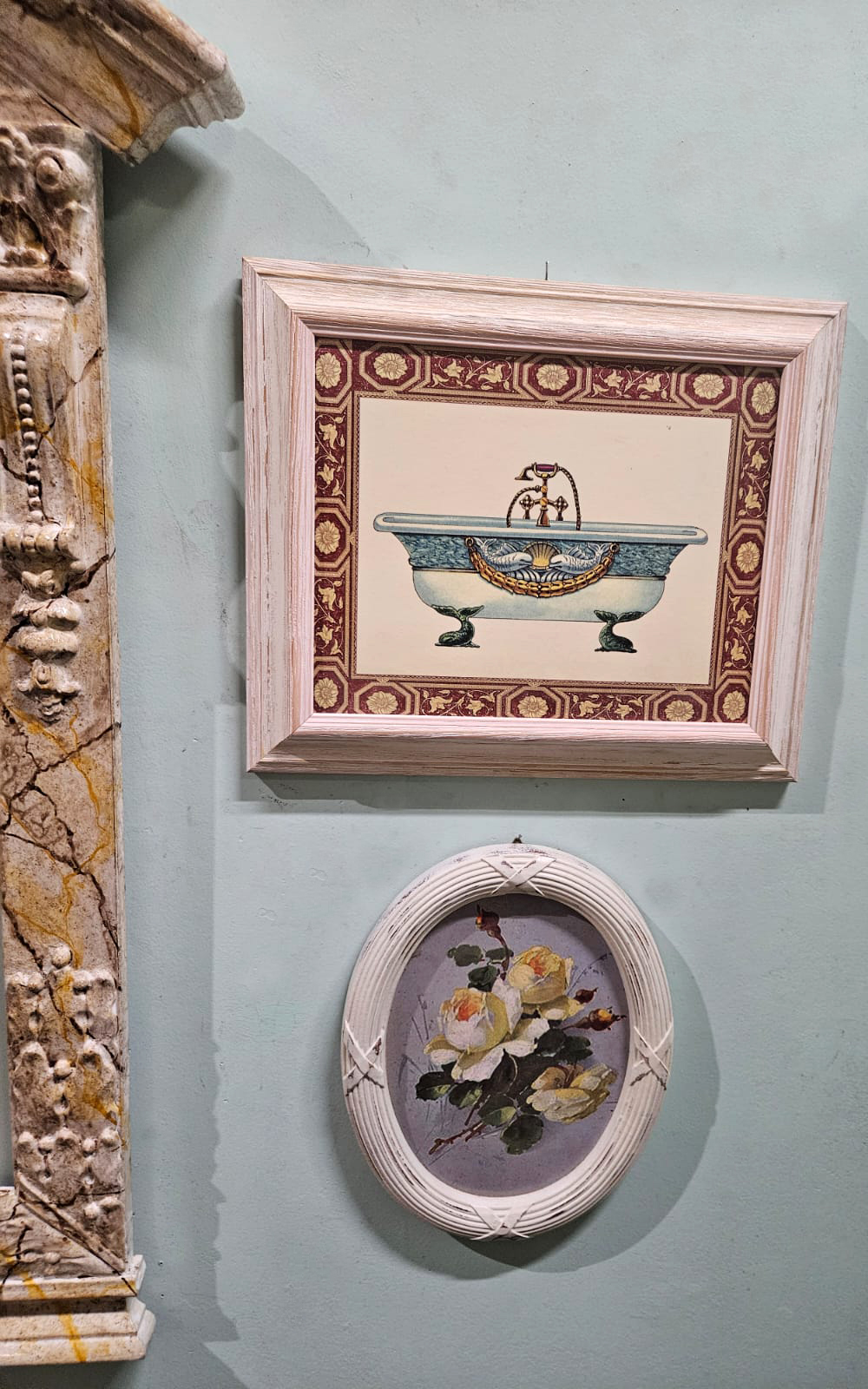 Specchio in legno stile marmorizzato dipinta a mano e smaltata, cm 50×60 misura specchio e cm 70×110 misura esterna; coppia di stampe con vasche da bagno cm 24×30 e coppia di ovali con fiori effetto ridipinto a olio cm 18×24.