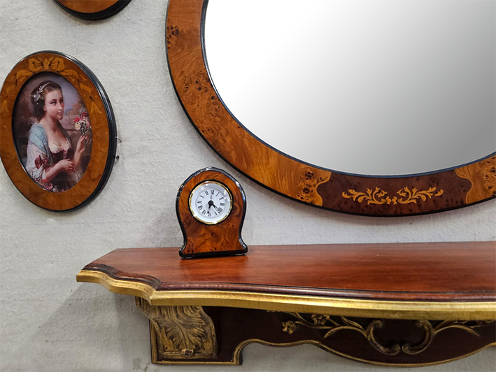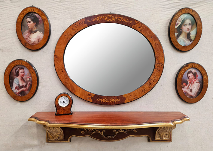 Completo da parete composto da specchio ovale con cornice in legno intarsiato in radica stile maggiolino, cm 40×50 misura interna, da 4 quadretti di fanciulle in cornici in legno intarsiate motivo nodo dell’amore cm 10×15 e da mensola in legno colore noce e oro cm 70x19x13. Compreso di sveglietta in radica.