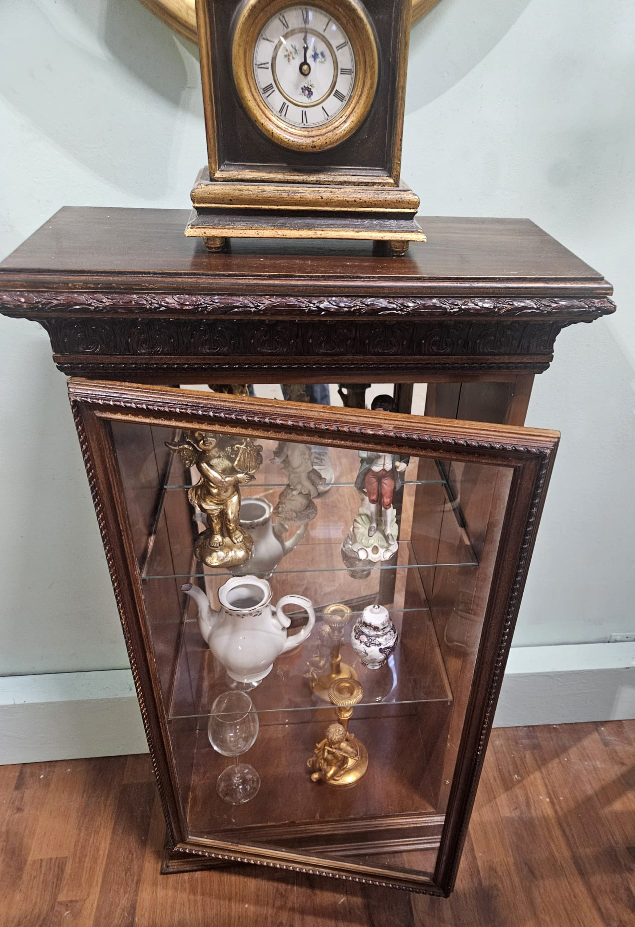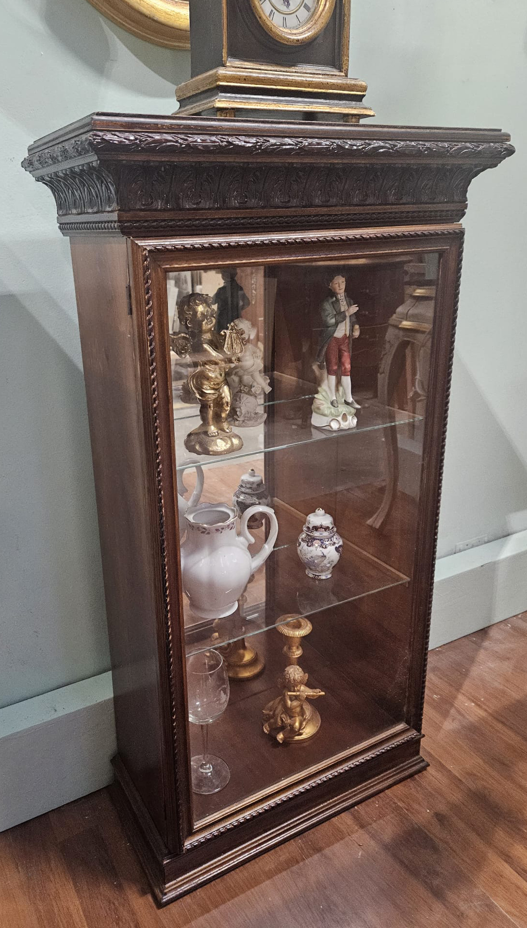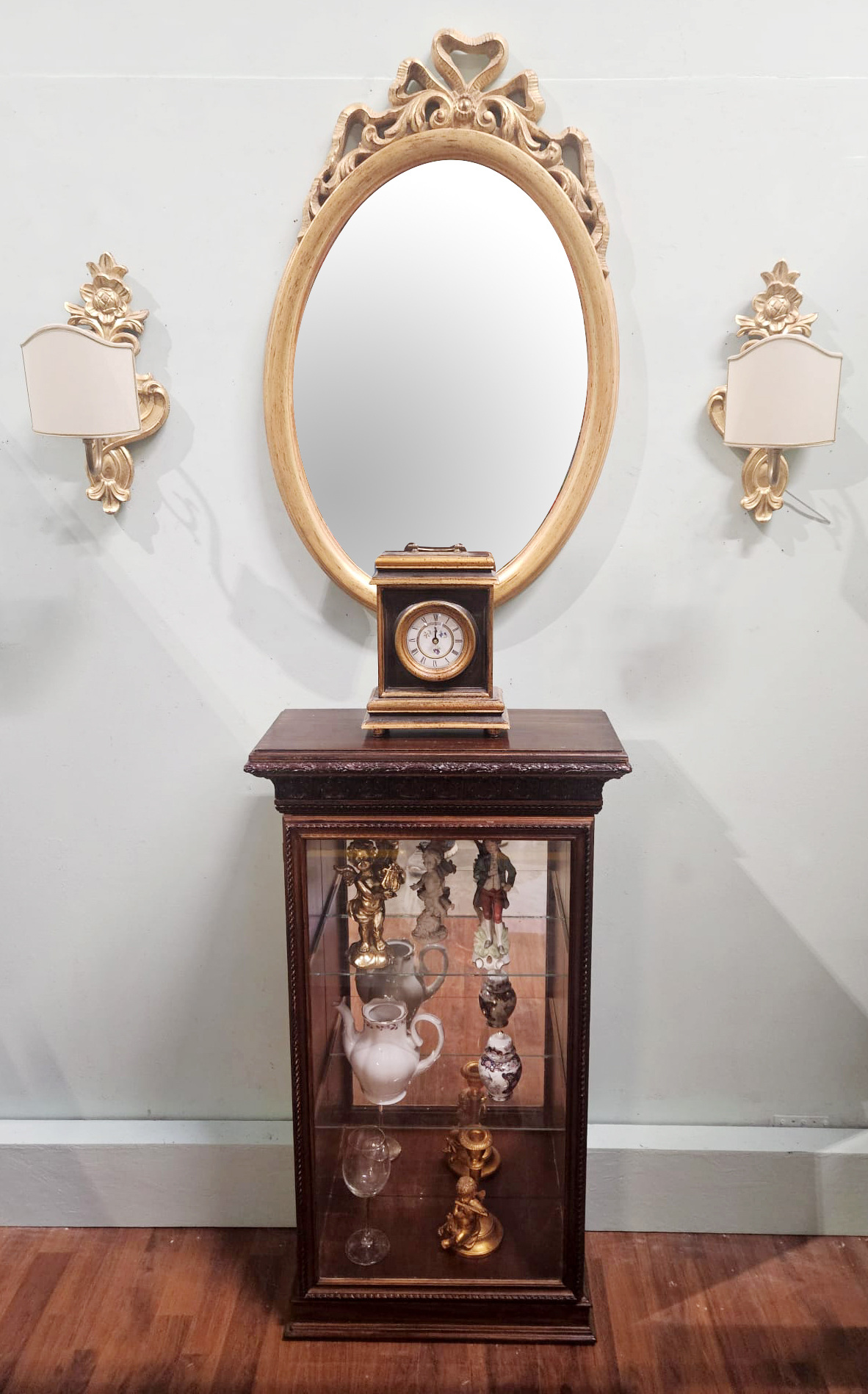 Completo composto da specchiera in legno colore oro foglia cm 50x70, da coppia di applique in legno con ventole, da orologio da appoggio colore noce e oro e da vetrina da terra in legno cm 102x50x23, con 3 ripiani interni distanti 27 cm, il piano di appoggio superiore misura cm 25x56.