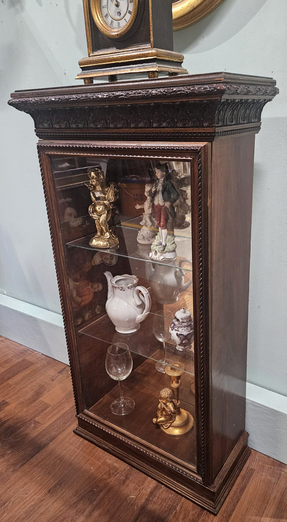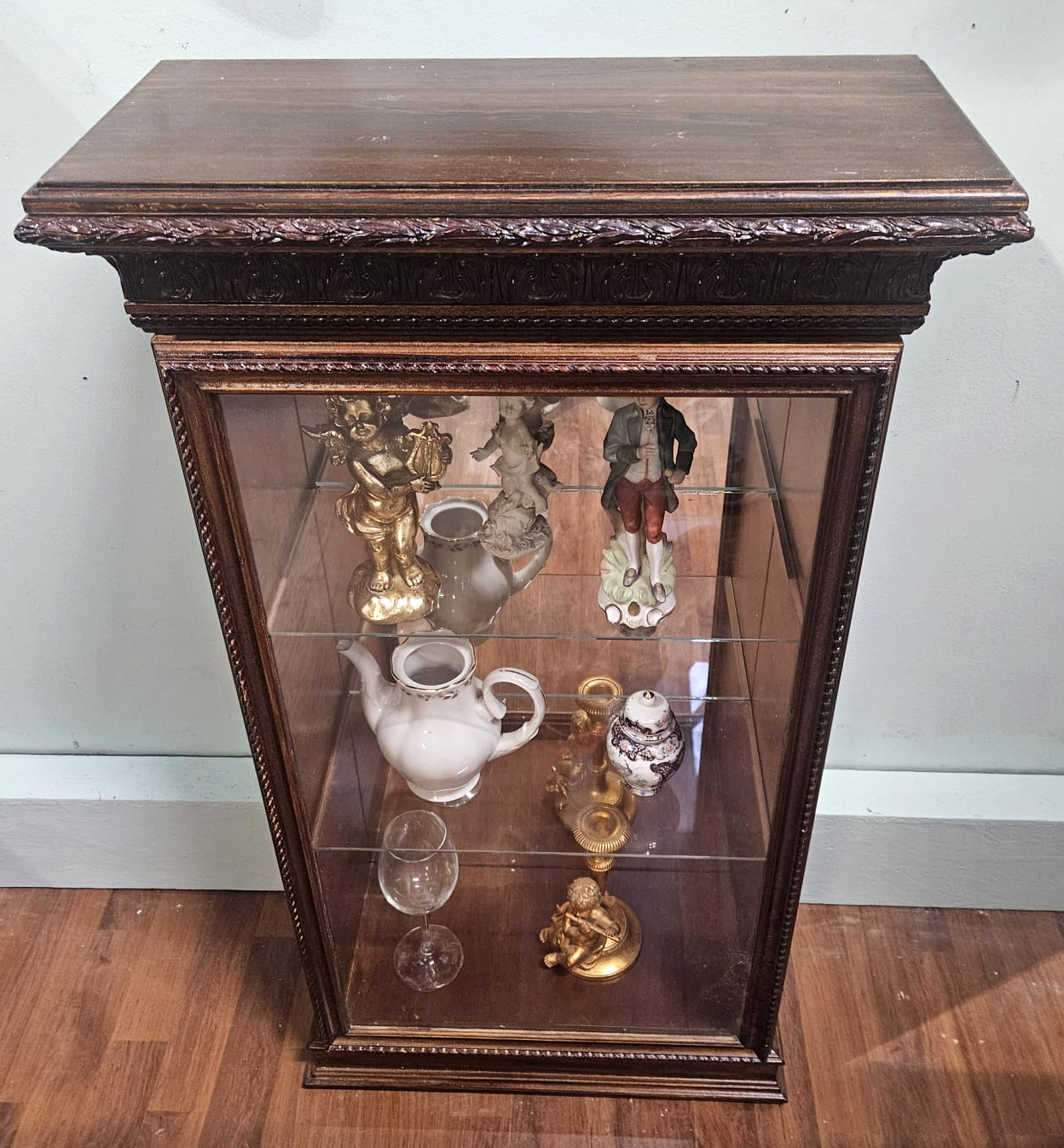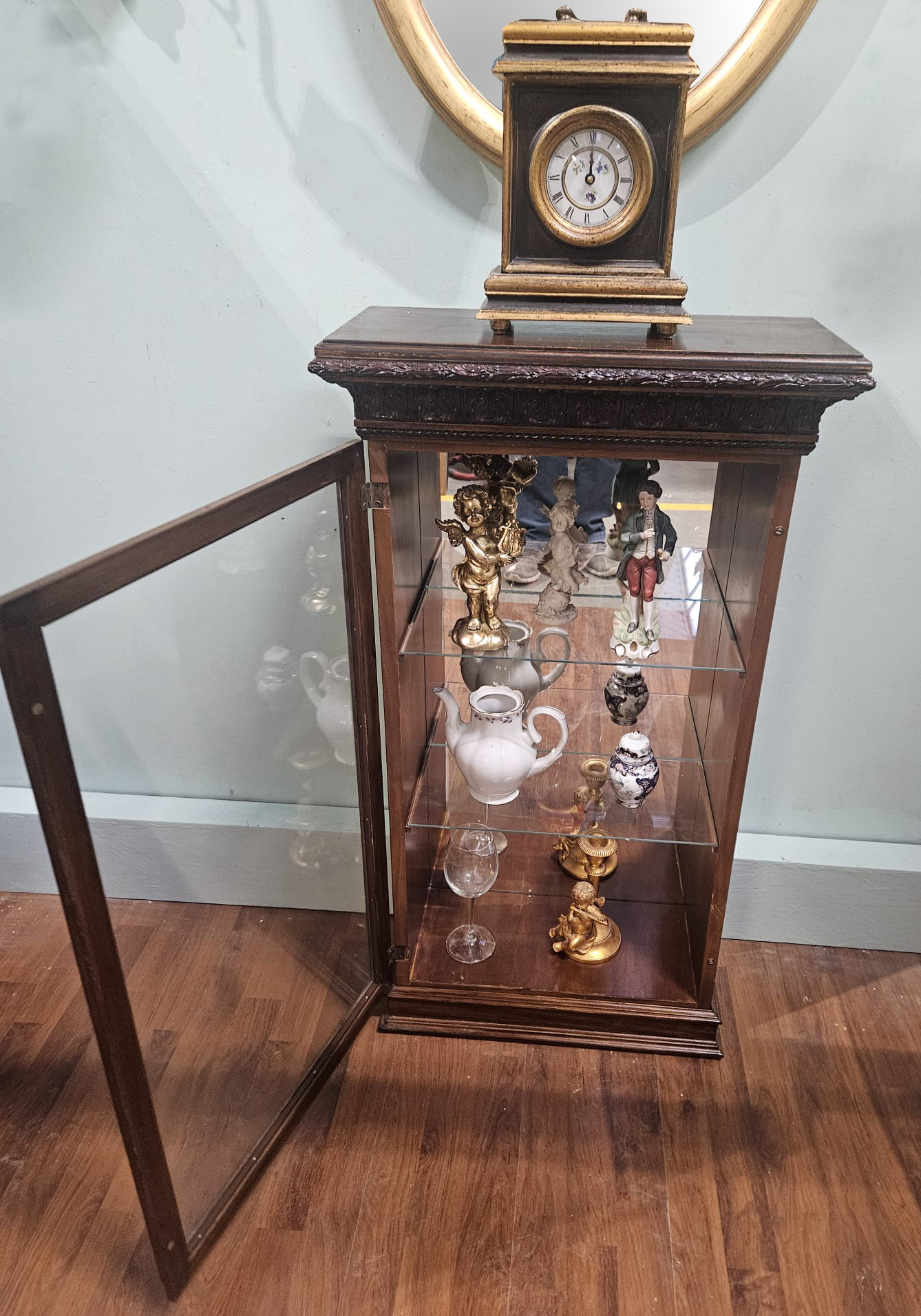 Completo composto da specchiera in legno colore oro foglia cm 50x70, da coppia di applique in legno con ventole, da orologio da appoggio colore noce e oro e da vetrina da terra in legno cm 102x50x23, con 3 ripiani interni distanti 27 cm, il piano di appoggio superiore misura cm 25x56.
