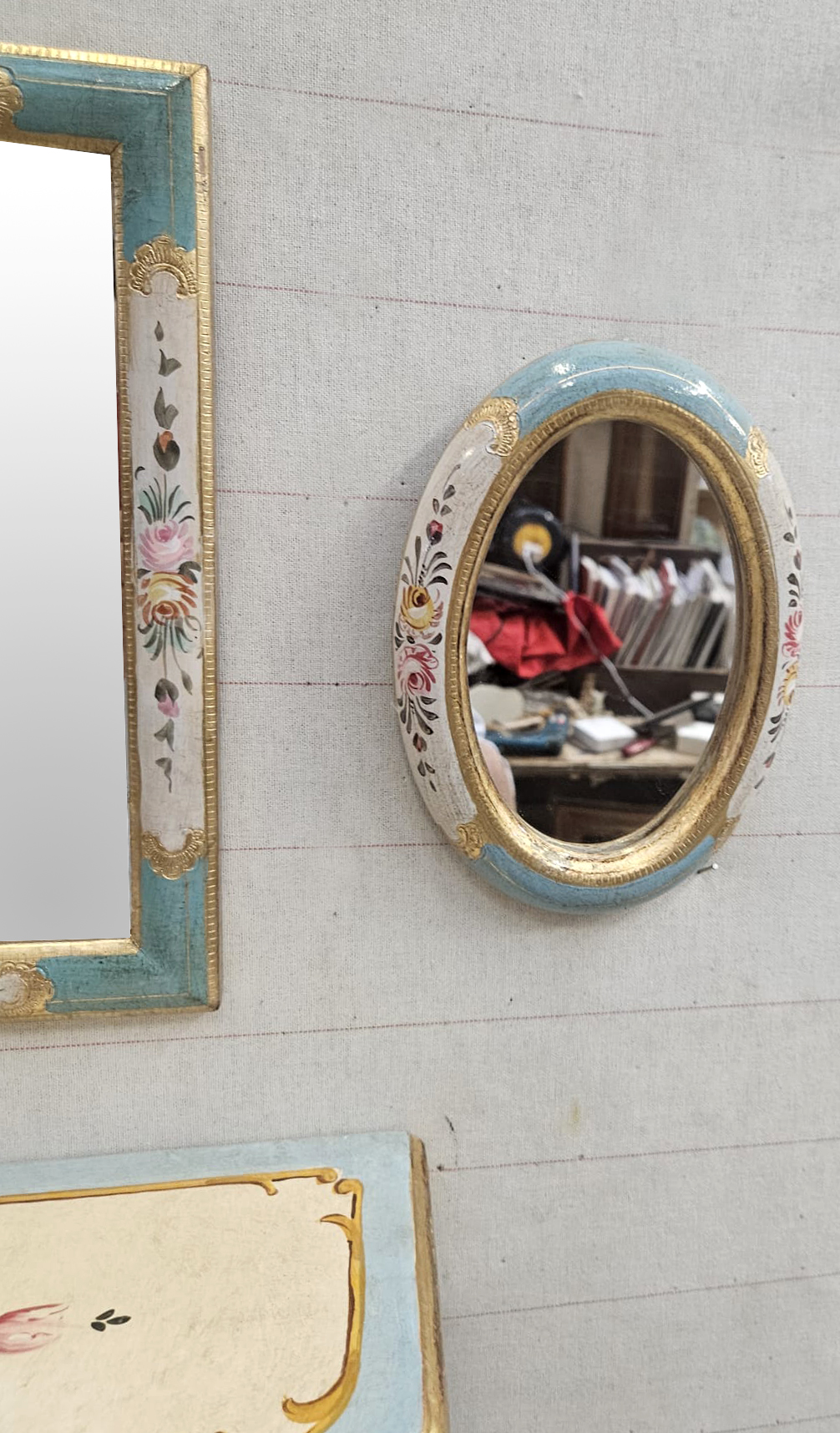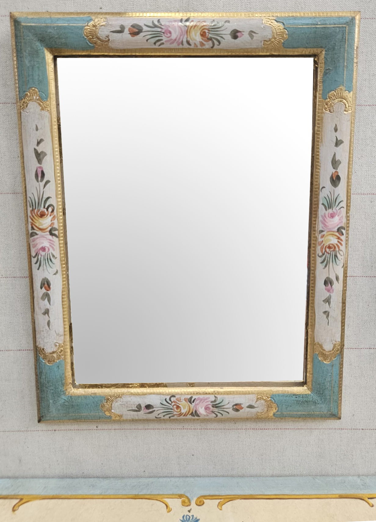 Completo composto da specchio in legno dipinto a mano e punzonati oro a mano da artisti fiorentini cm 18×24 misura interna e cm 22×28 misura esterna, da due specchietti cm 10×15 e da mensola cm 35x16x9 dipinta a mano.