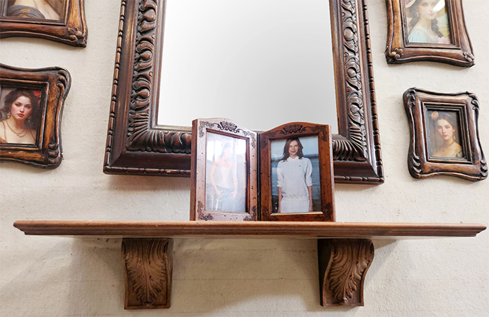 Completo da parete composto da specchiera in legno jelutong intagliata interamente a mano con finitura noce medio a cera cm 40x50 misura interna; da 4 stampe di dame con vetro in cornici in legno intagliate a mano di cui 2 cm 13x18 interno e 2 cm 9x12 interno; da mensola in legno con capitelli colore noce con piano cm 68x22.