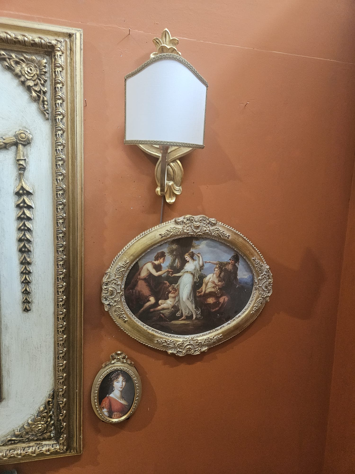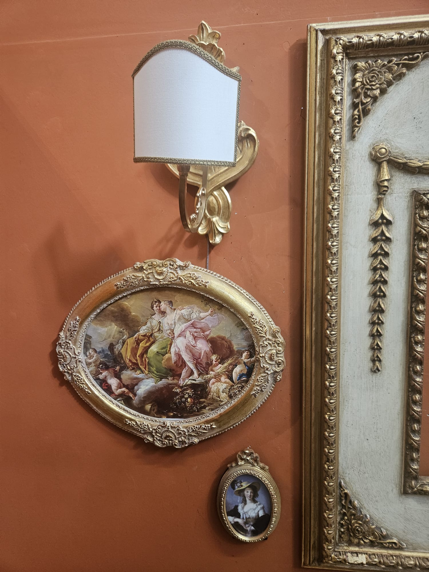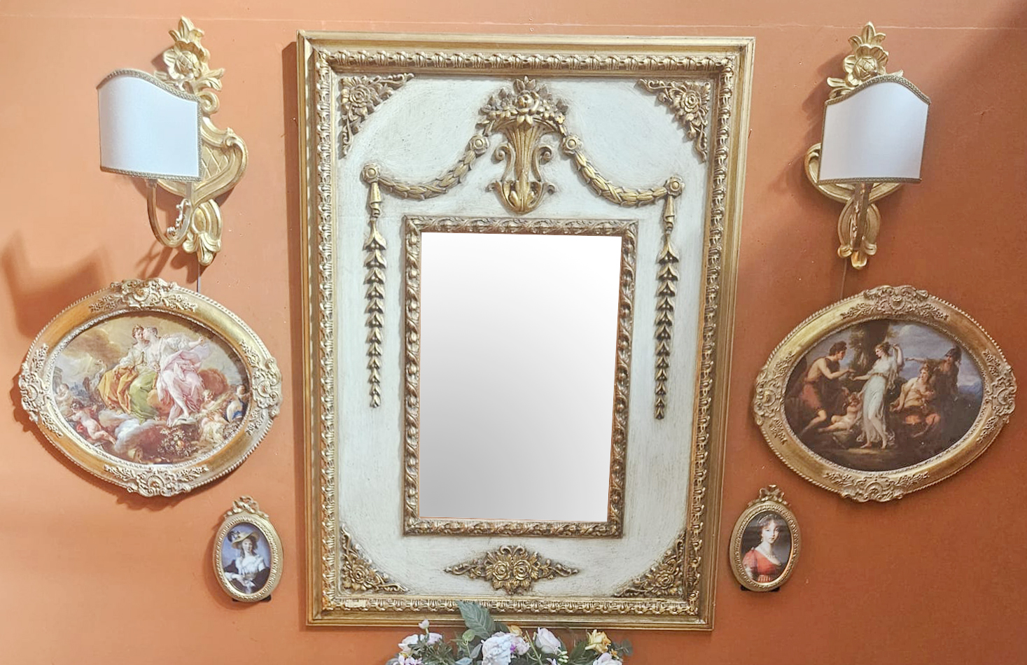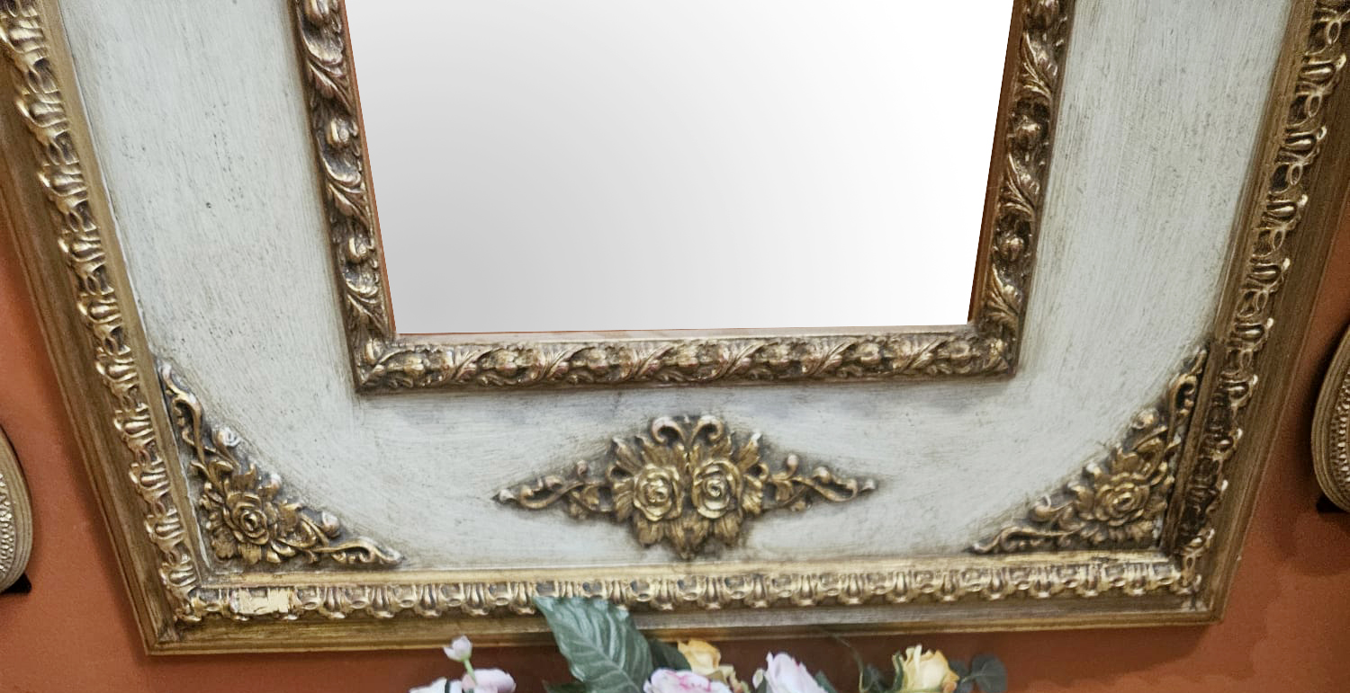 Completo composto da specchiera in legno oro foglia e panna invecchiata cm 38×54 misura interna e cm 80×107 misura esterna, da coppia di applique in legno oro foglia con ventole, da coppia di quadretti cm 13×18 e da coppia di quadri cm 30×40.