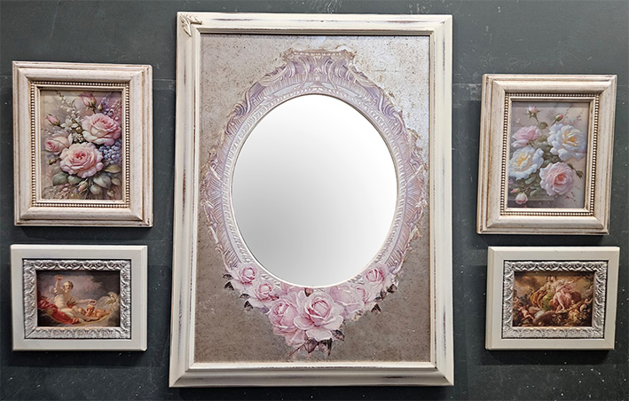 Completo composto da specchio da parete in legno colore bianco provenzale con passepartout con rose e argento foglia, cm 33×39 misura specchio e cm 58×78 misura esterna, da coppia di stampe floreali cm 18×24 e da coppia di stampe con scene mitologiche cm 13×18.