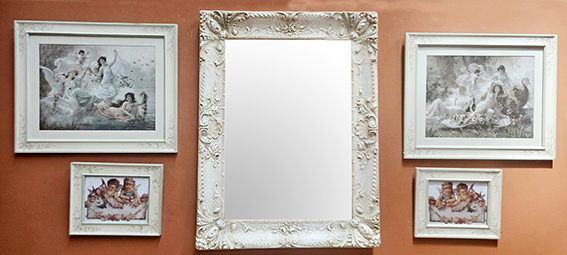 Completo composto da specchio in legno con cornice francesina colore panna provenzale cm 50x70 misura interna e cm 70x90 misura esterna, da coppia di incisioni cm 40x50 e da 2 stampe con vetro cm 18x24.
