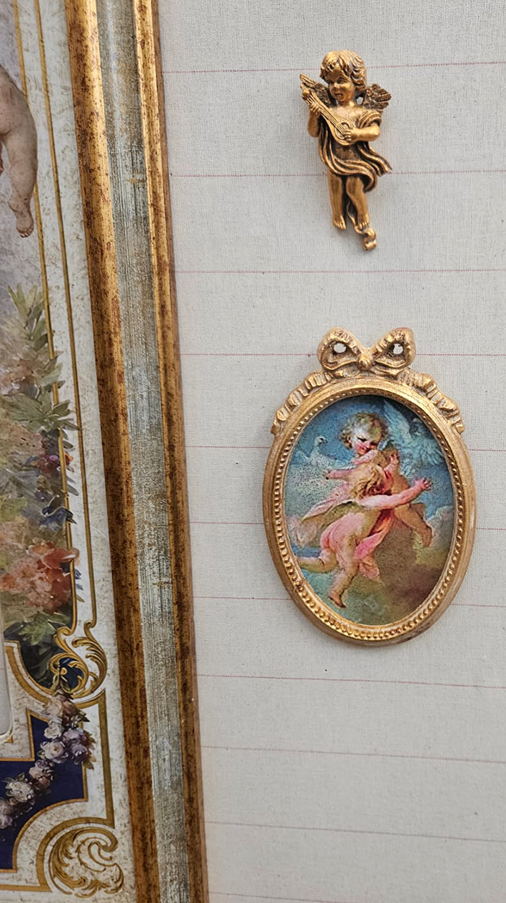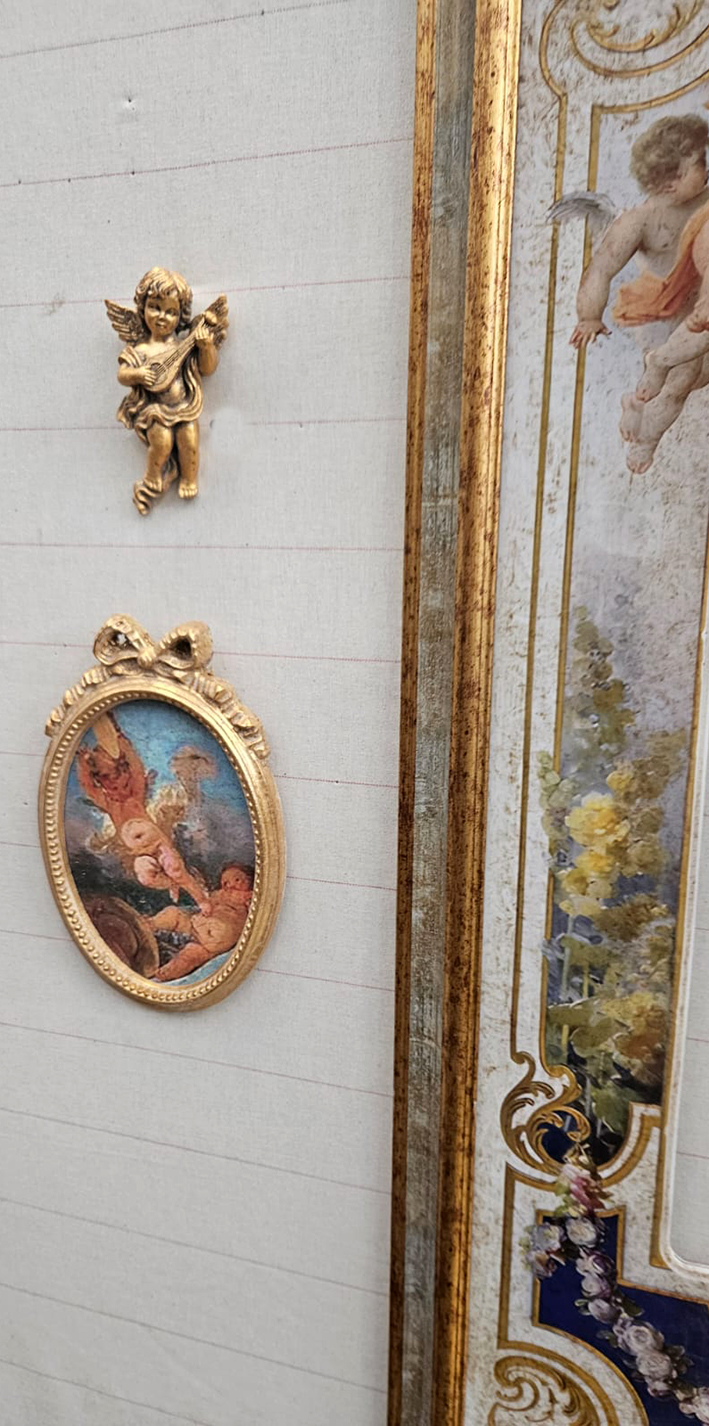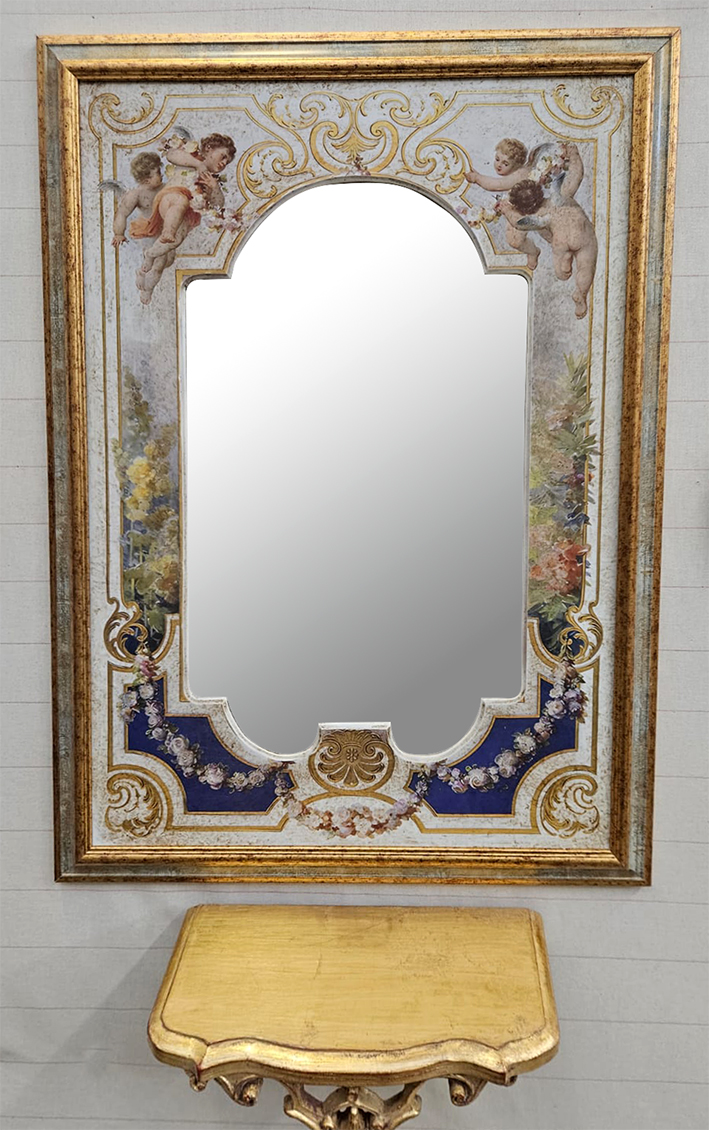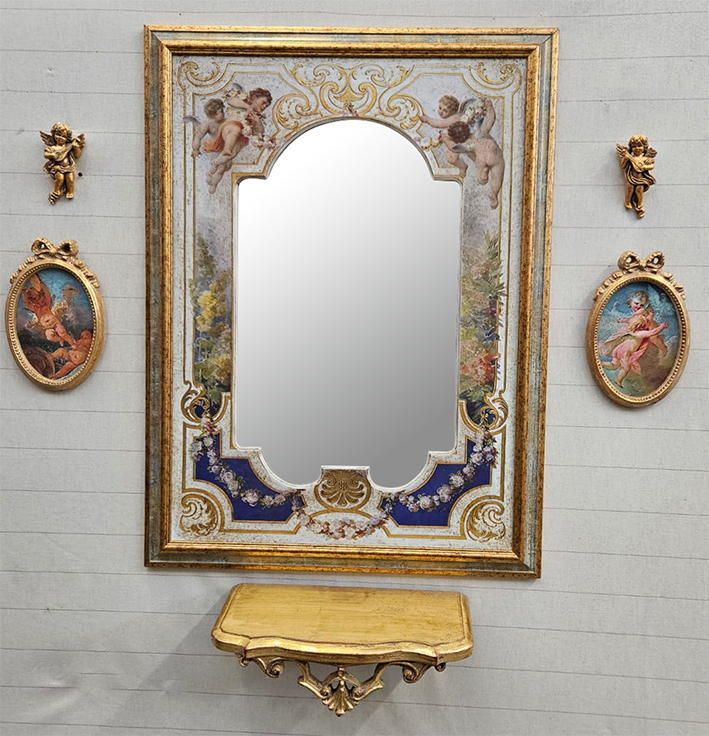 Completo composto da specchio da parete in legno con cornice colore oro foglia e turchese antico, e con passepartout serigrafato su legno soggetto angiolini, cm 56×76 misura esterna; da 2 stampe di puttini in cornici in legno oro foglia cm 13×18 e da mensolina in legno foglia oro cm 35x16x9. Compreso di due puttini suonatori in resina foglia oro.