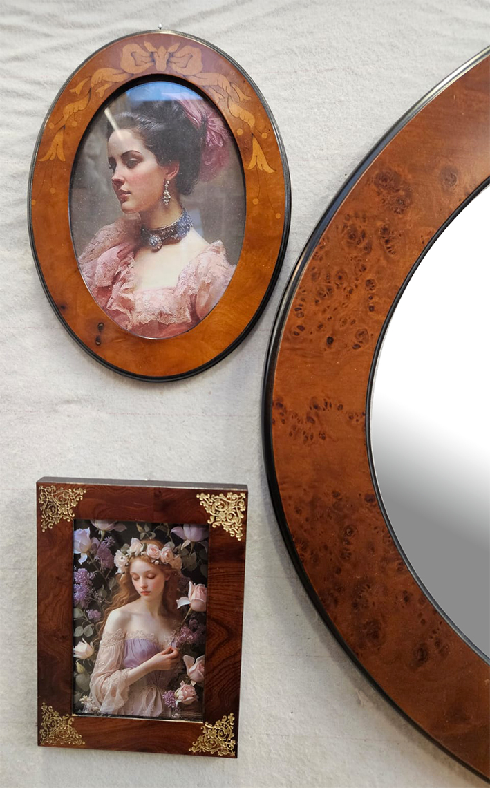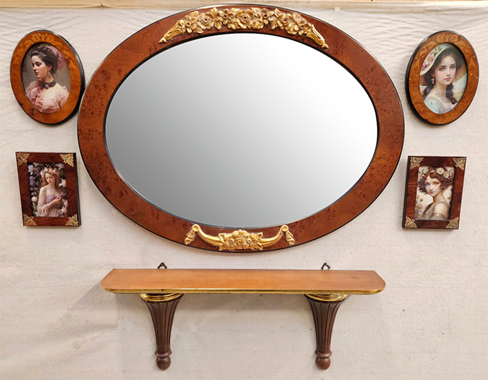 Completo da parete composto da specchio in legno placcato radica in stile impero con fregi oro foglia, cm 50×70 misura interna, da 2 cornici ovali intarsiate nodo dell’amore cm 10×15 e 2 cornici in radica punzonate oro cm 10×15 con stampe di fanciulle.