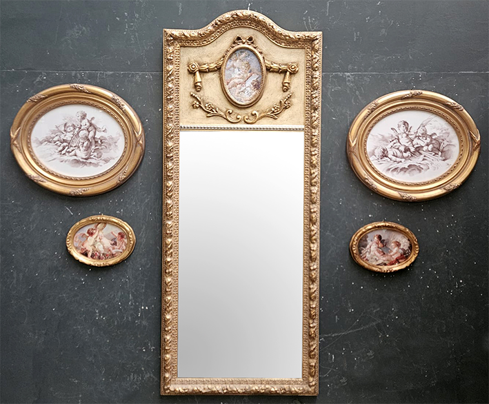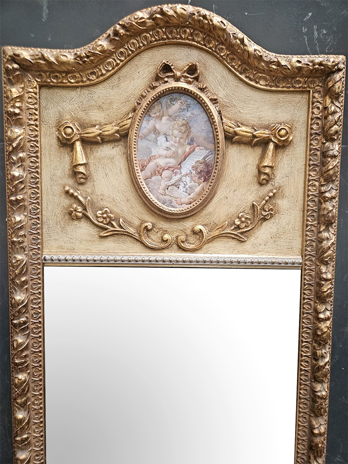 Completo composto da specchio in stile 700 francese, in cornice in legno pastellato oro foglia con fregi e con stampa di puttini simil dipinto, cm 50×110 misura esterna e cm 40×75 misura specchio, da coppia di incisioni in sanguigna di puttini in cornici in legno stile imp0ero oro foglia cm 40×33 misura esterna e da coppia di stampe di puttini cm 16×21.