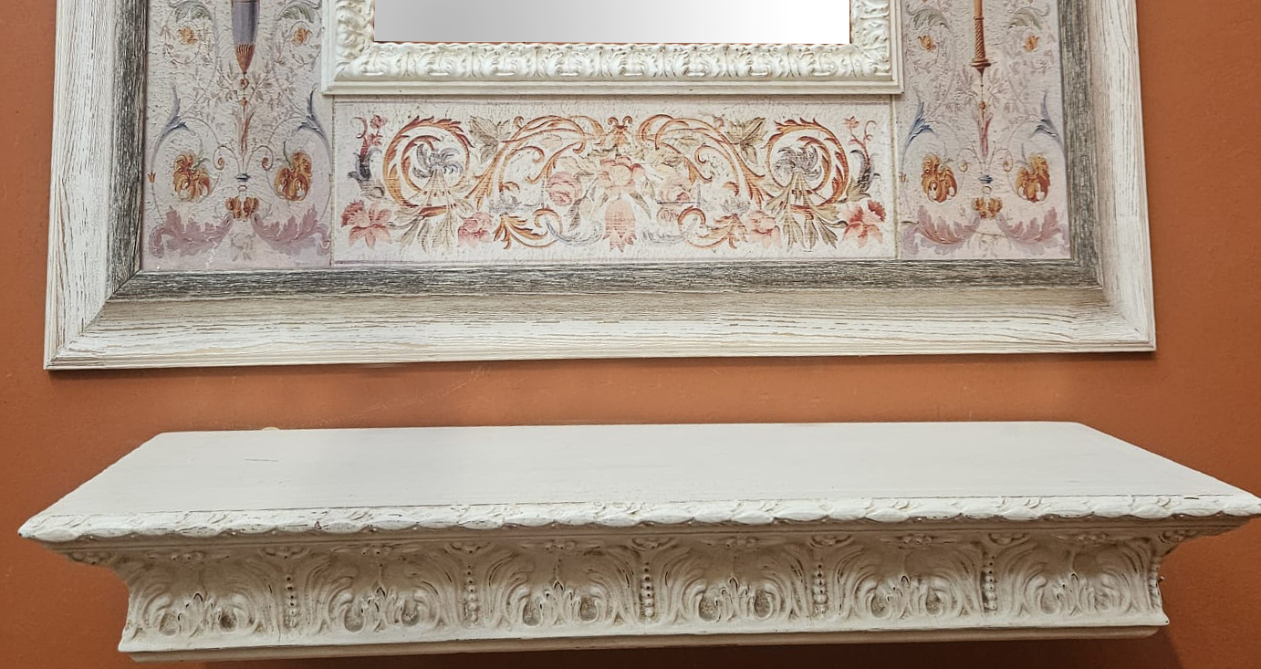 Specchio in legno con doppia cornice bianco provenzale, con passepartout con decoro simil dipinto cm 40×38 misura interna e cm 78×80 misura esterna, con cornice oro pastigliato e colore bronzo cm 34×44 esterno.