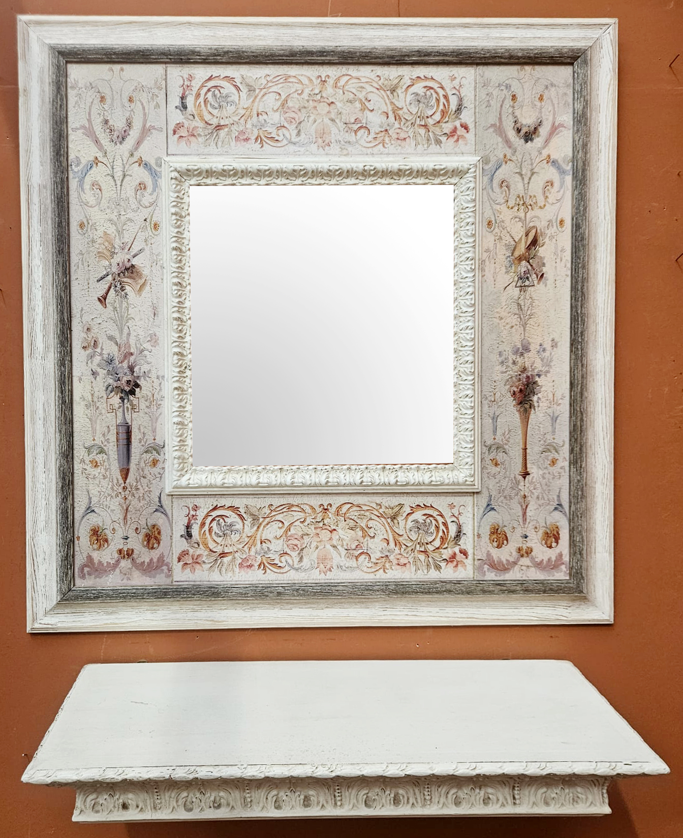Specchio in legno con doppia cornice bianco provenzale, con passepartout con decoro simil dipinto cm 40x38 misura interna e cm 78x80 misura esterna.