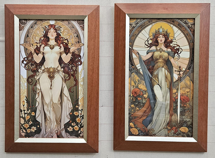 Coppia di stampe di fanciulle con vetro e in cornici in legno ciliegio e argento cm 23×42 misura interna e cm 31×50 misura esterna.