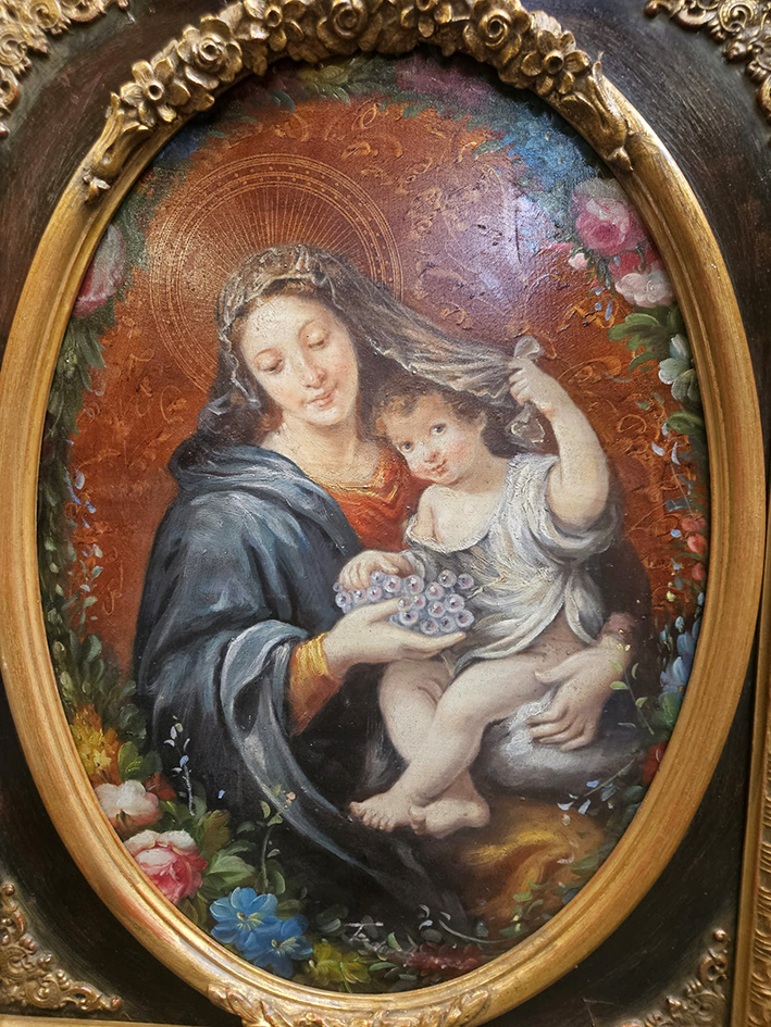 Dipinto ad olio su tela soggetto Madonna dell’uva di Murillo in doppia cornice in legno settecentesca oro foglia con fregi dorati, cm 50×70 misura interna e cm 68×78 misura esterna.