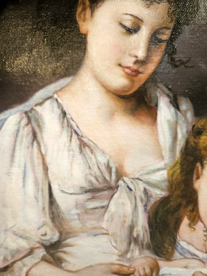 Dipinto ad olio su tela soggetto madre con figli in doppia cornice in legno noce e oro cm 40×50 misura interna e cm 58×68 misura esterna.
