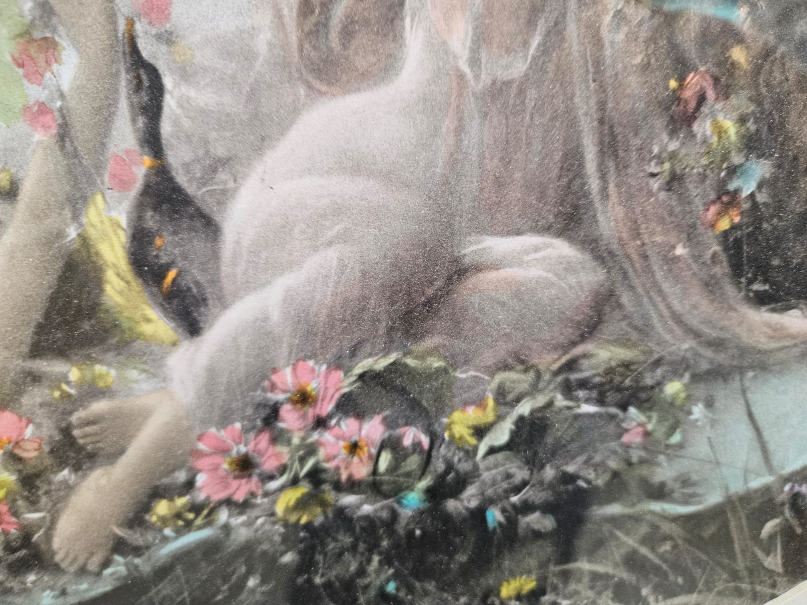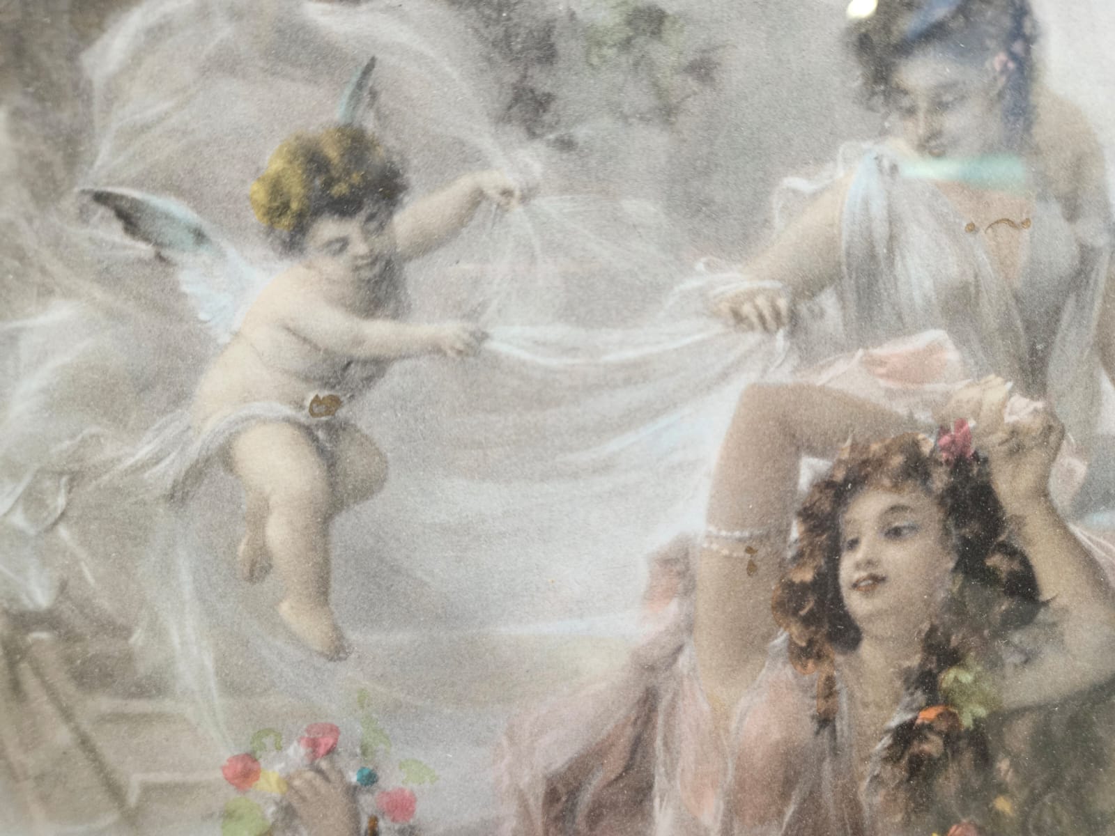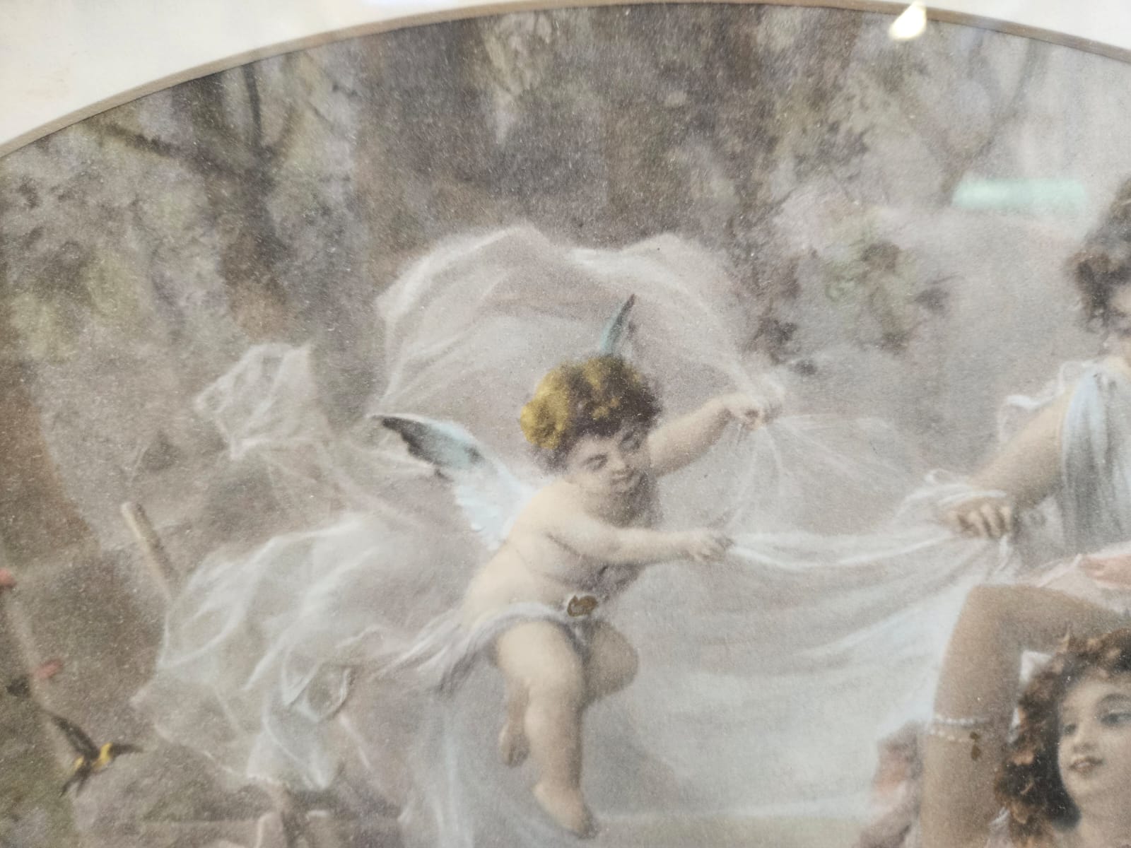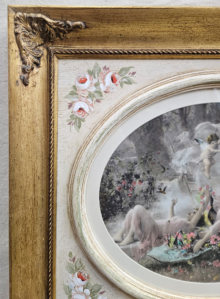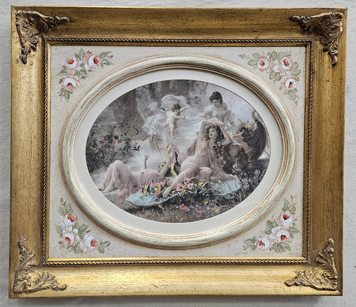 Incisione di una festa primaverile in doppia cornice in legno colore oro foglia esterna e ovale bianco provenzale con rose dipinte a mano interna, cm 40x50 misura interna e cm 60x70 misura esterna.
