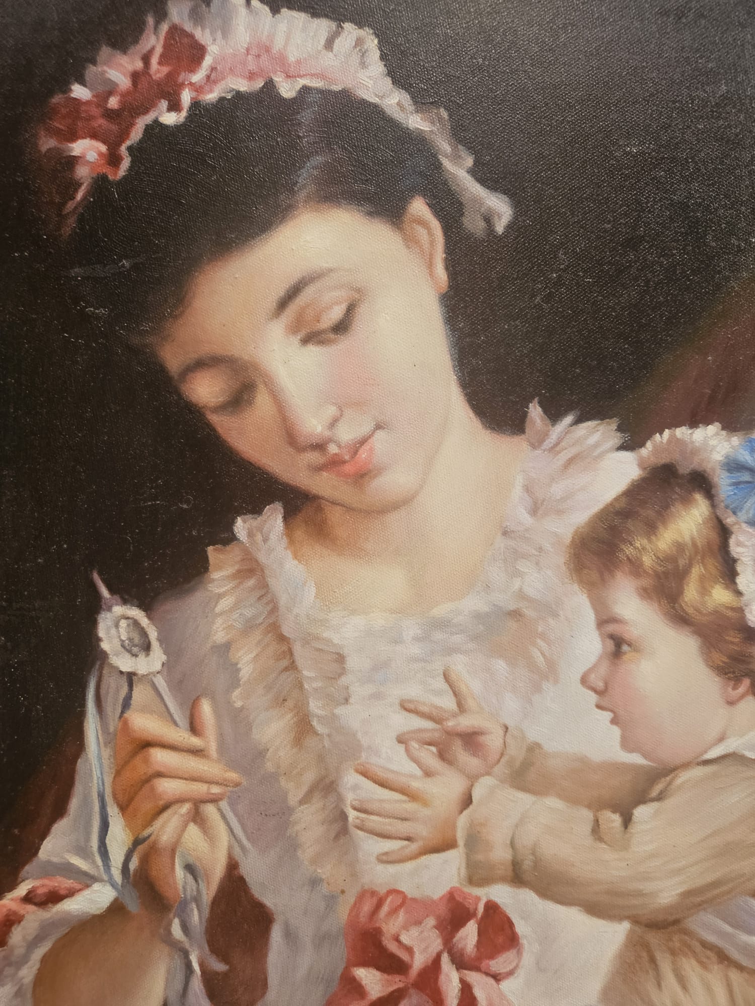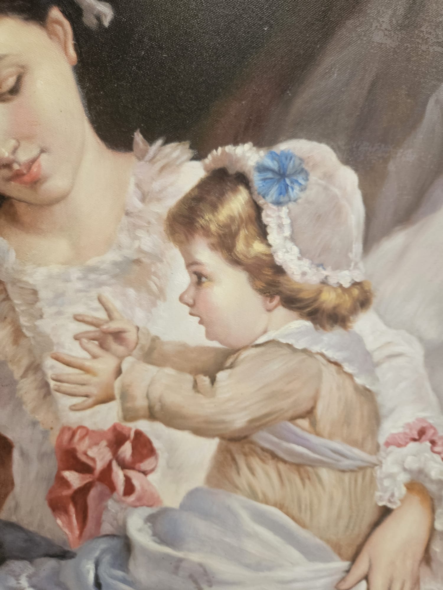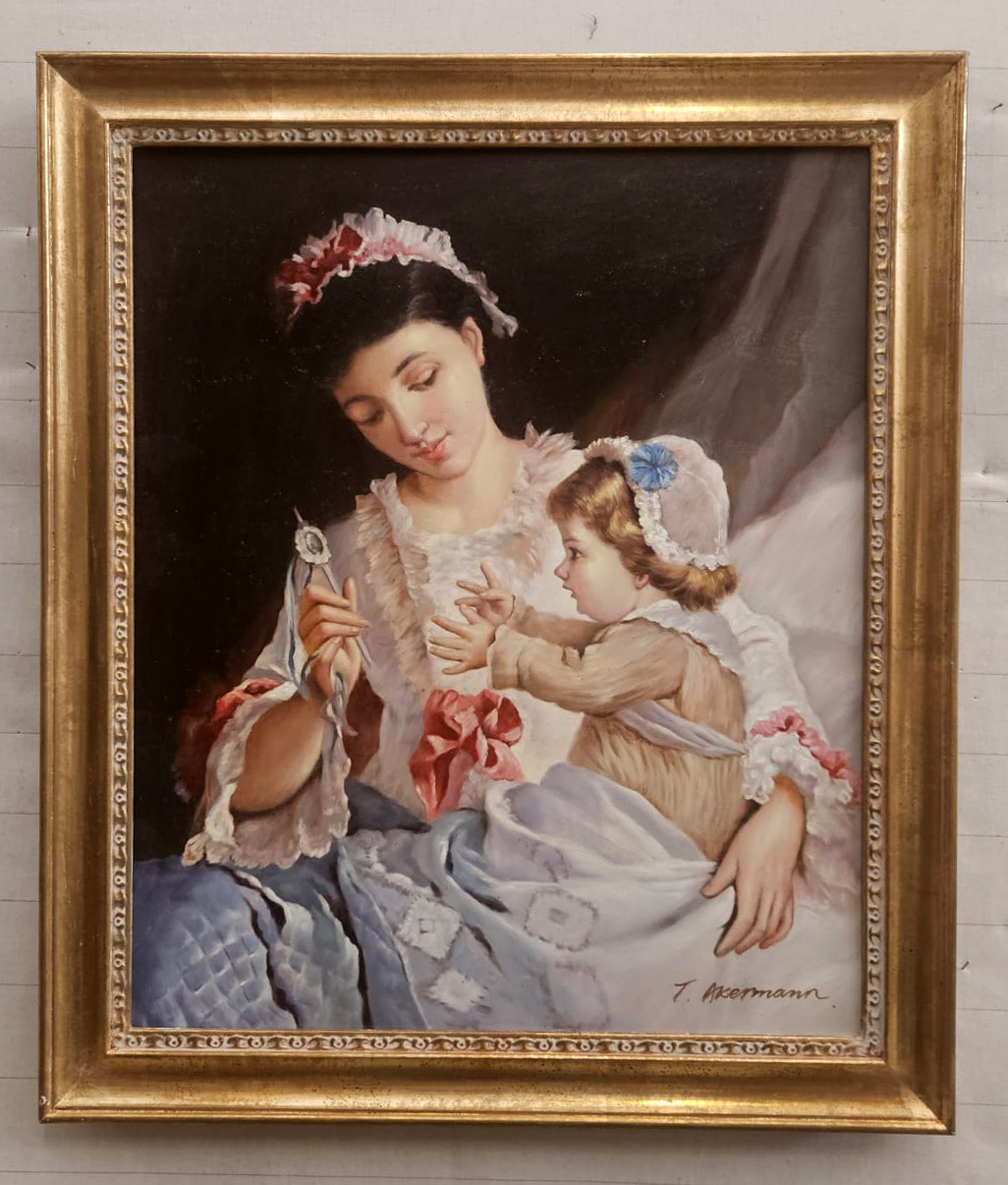 Dipinto ad olio su tela soggetto Maternità di Munier in cornice guantiera oro guazzo lucidata a pietra d’agata cm 50×60 misura interna.