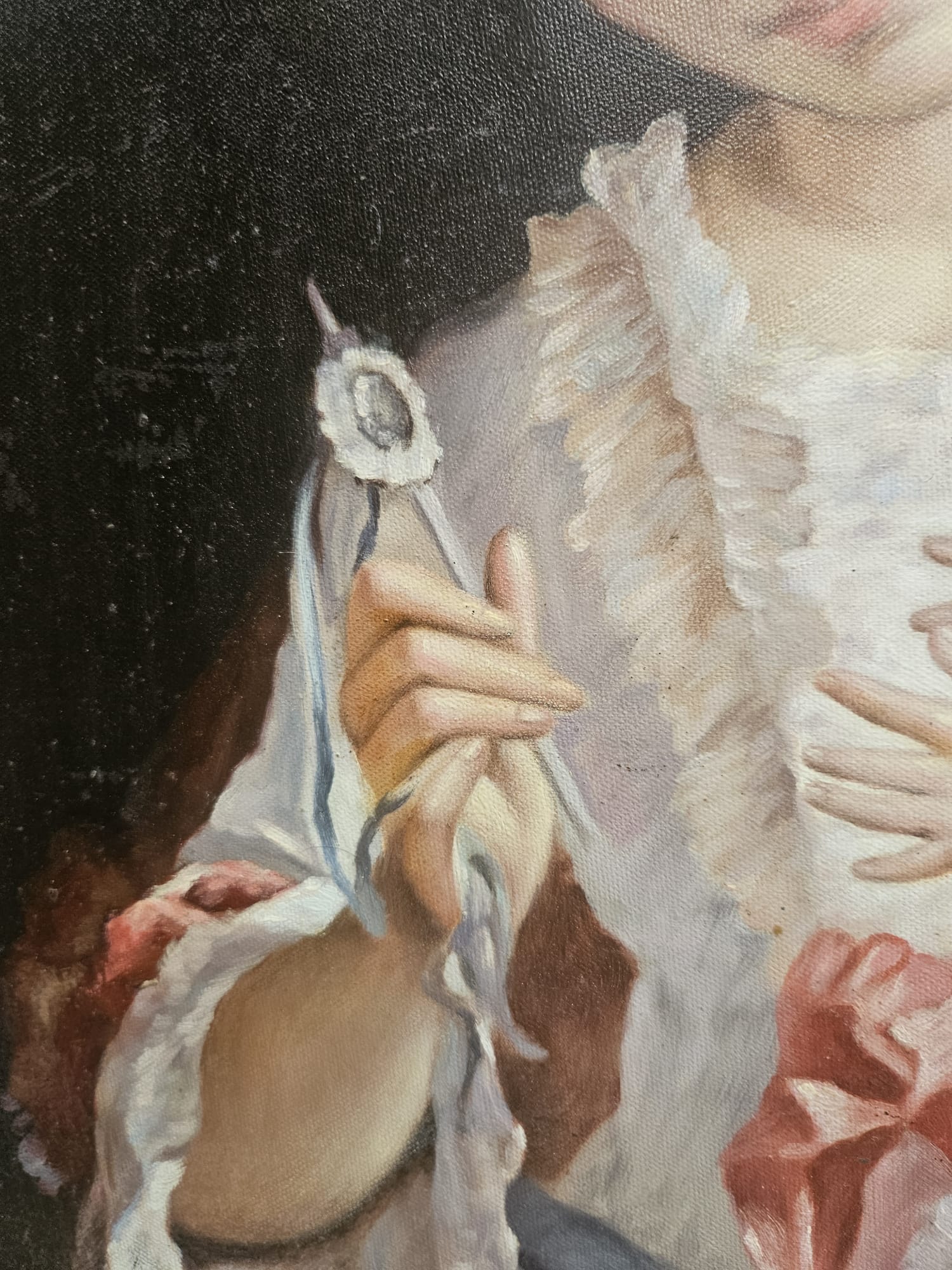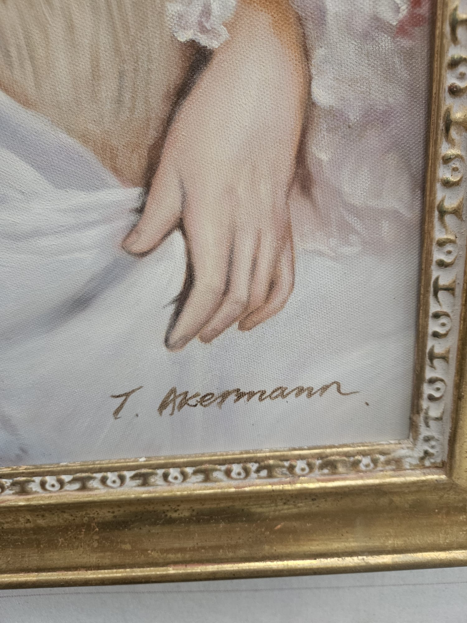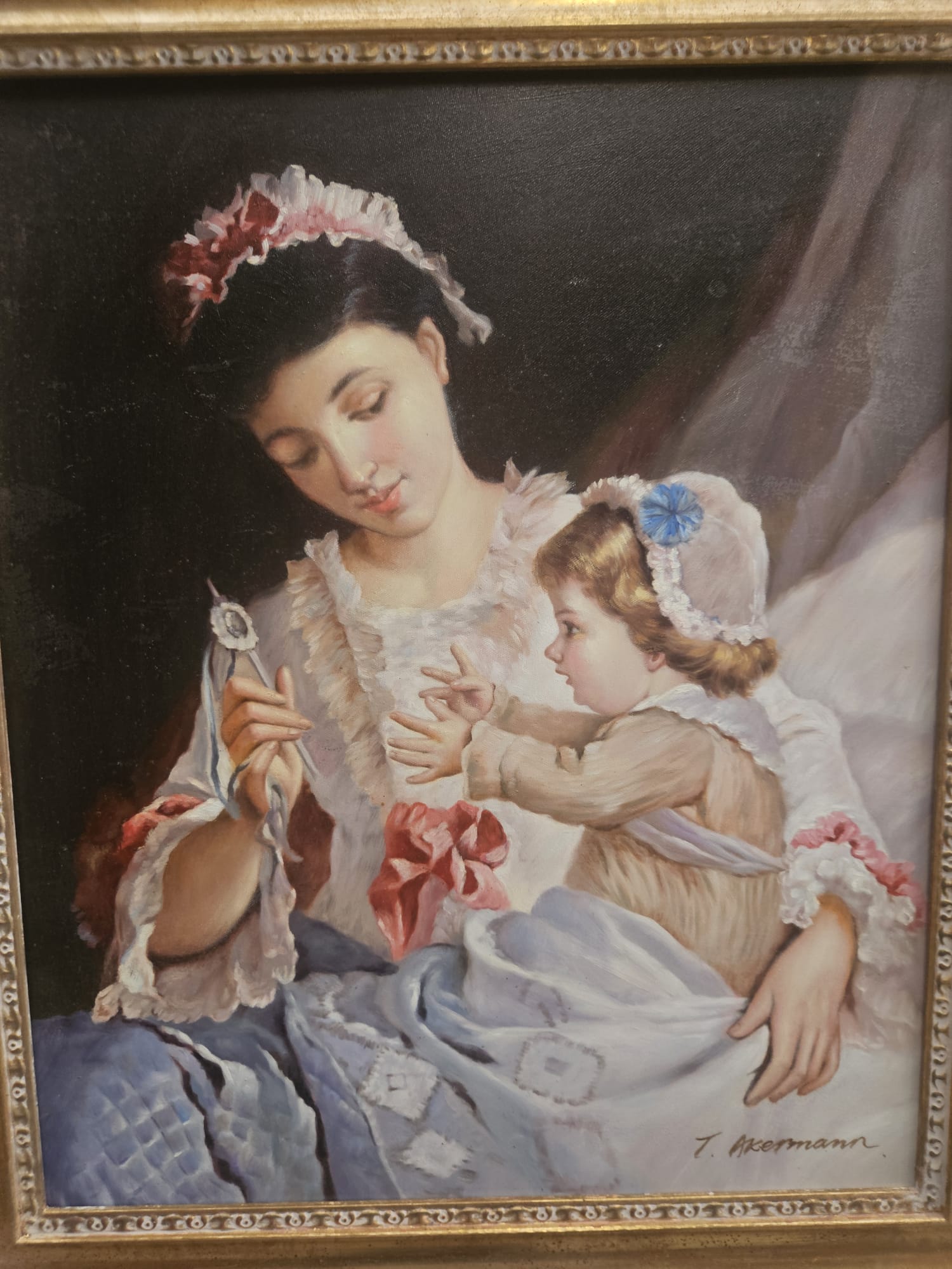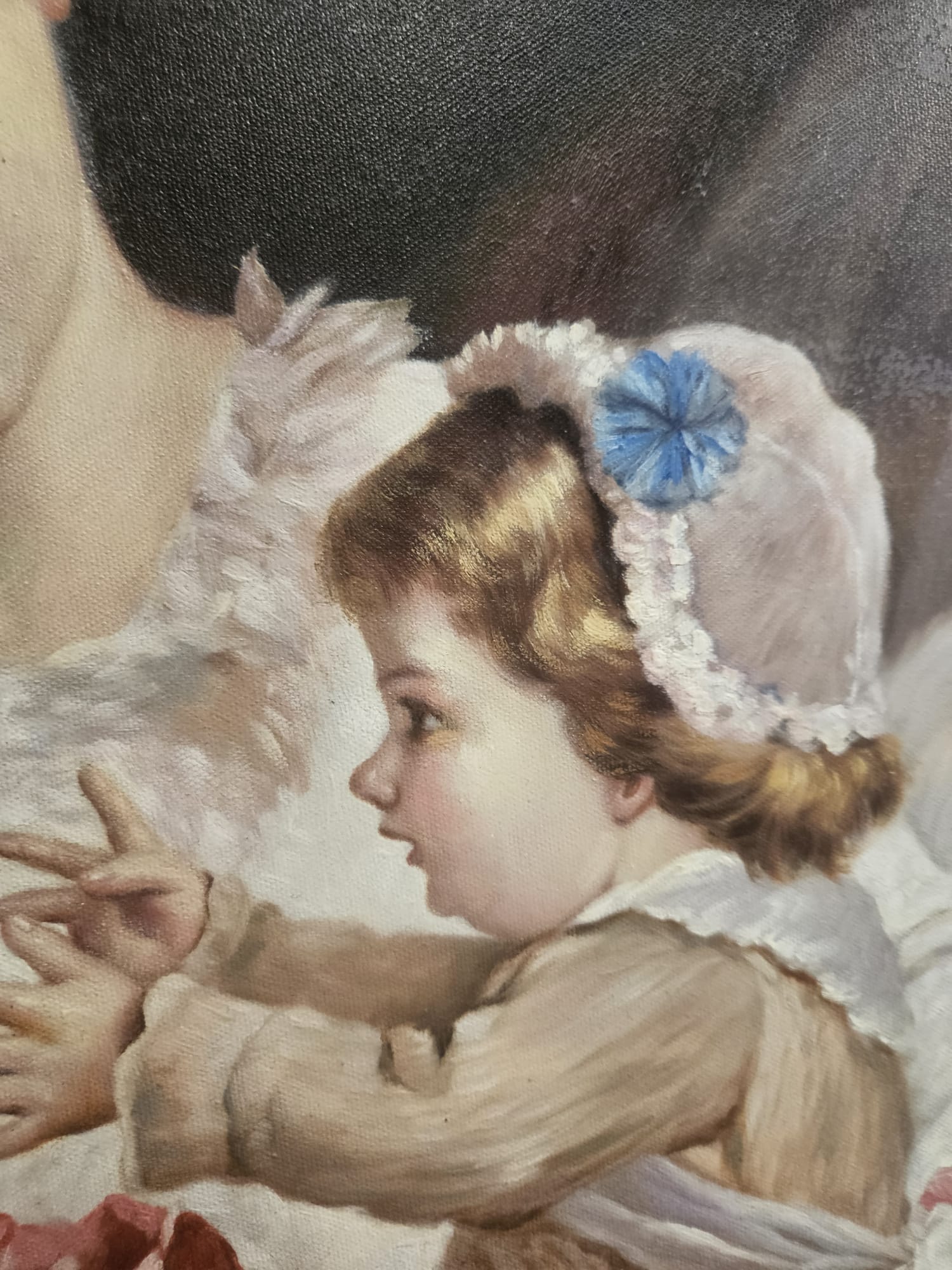Dipinto ad olio su tela soggetto Maternità di Munier in cornice guantiera oro guazzo lucidata a pietra d’agata cm 50×60 misura interna.