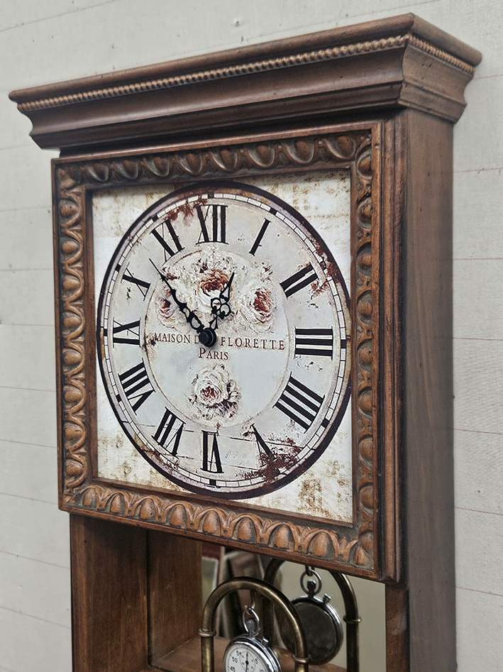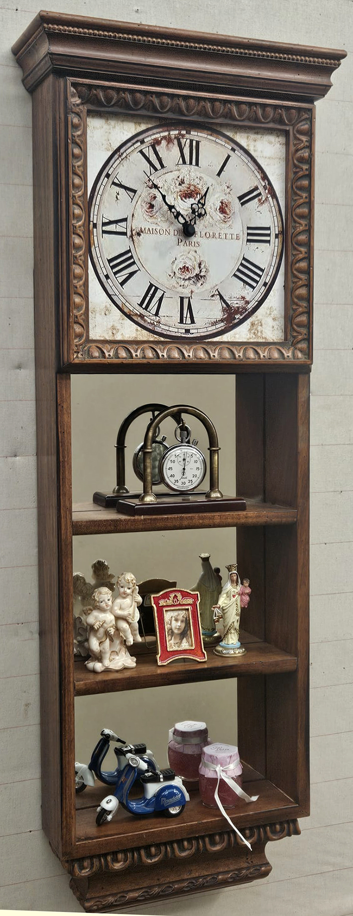 Orologio da parete con mobiletto a tre ripiani con fondo specchio, cm 34x94x9.