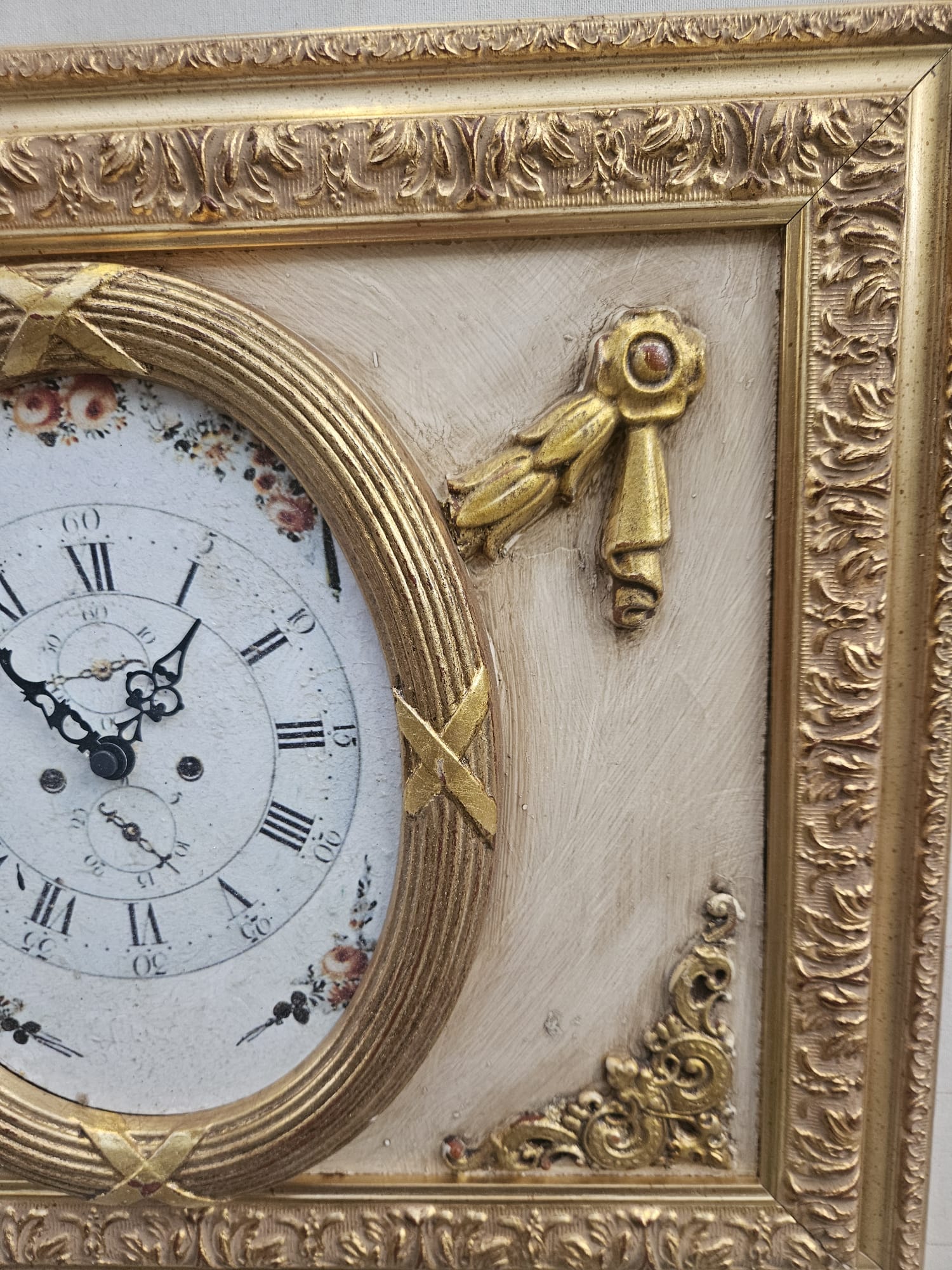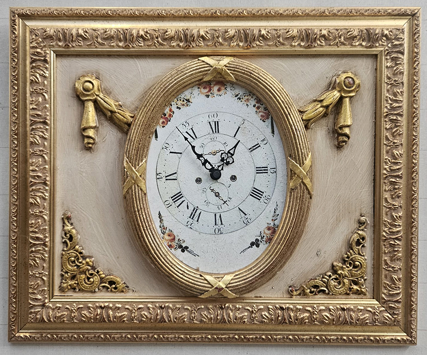 Orologio da parete in doppia cornice in legno oro, quadrante stampato ovale in cornice stile impero, cm 40×50 misura esterna.