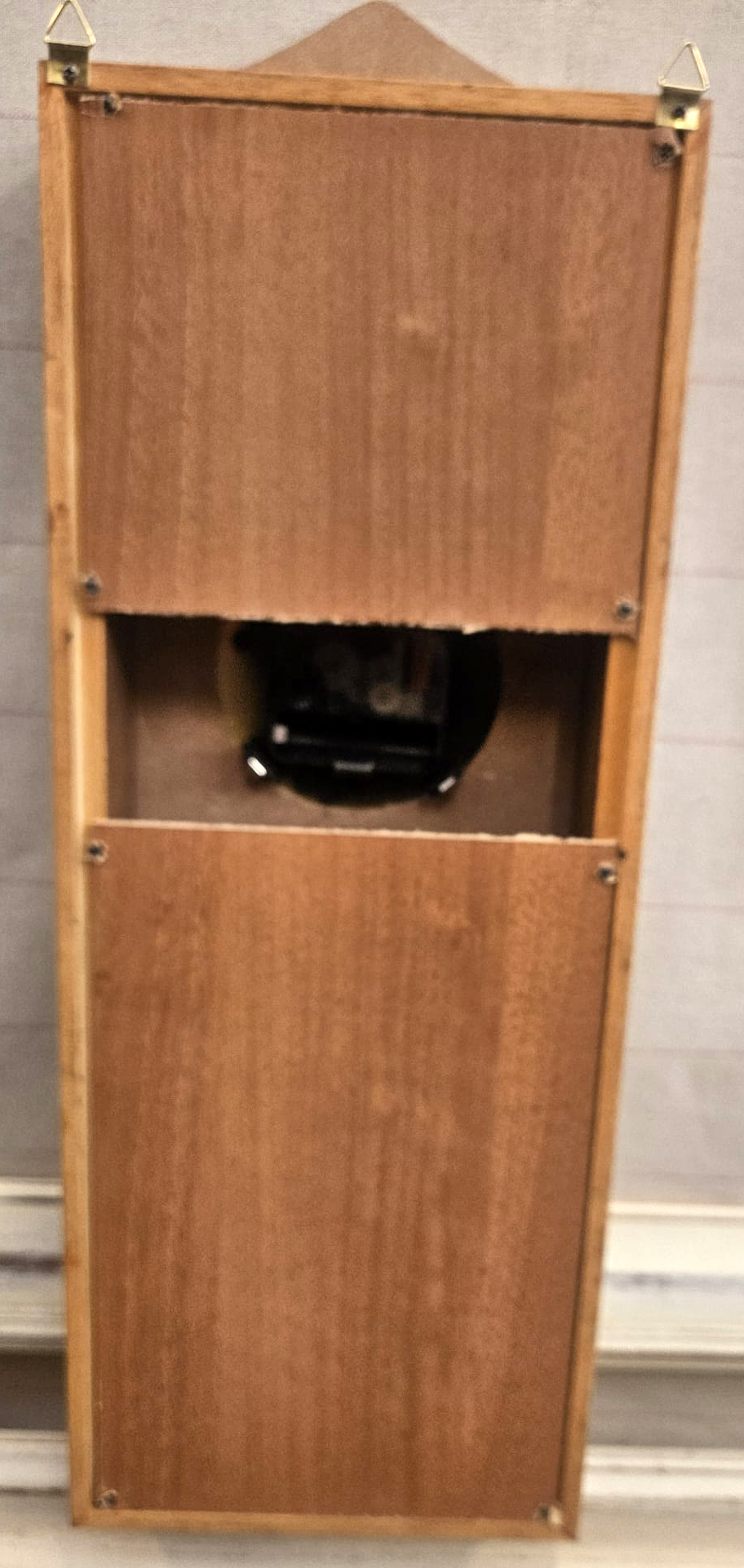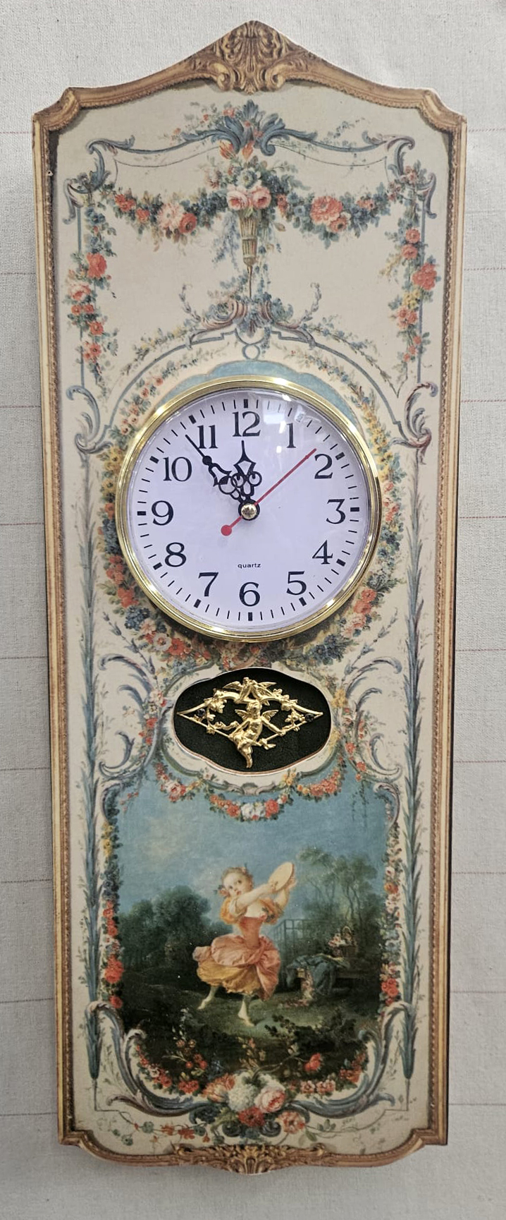 Orologio da parete in legno stile francese, con fregio in ottone, cm 48x17x5. Funziona a pile con movimento made in Germany.