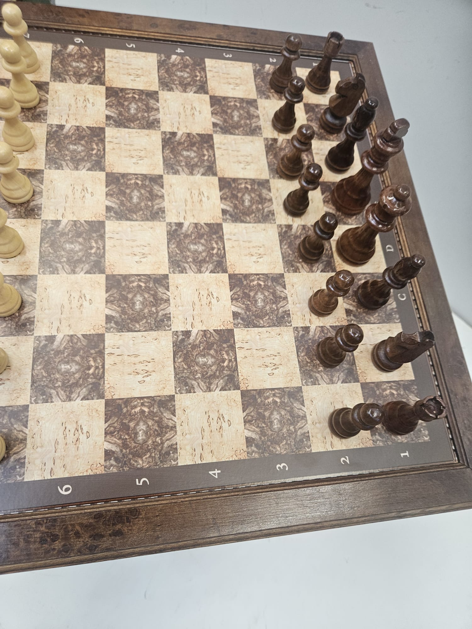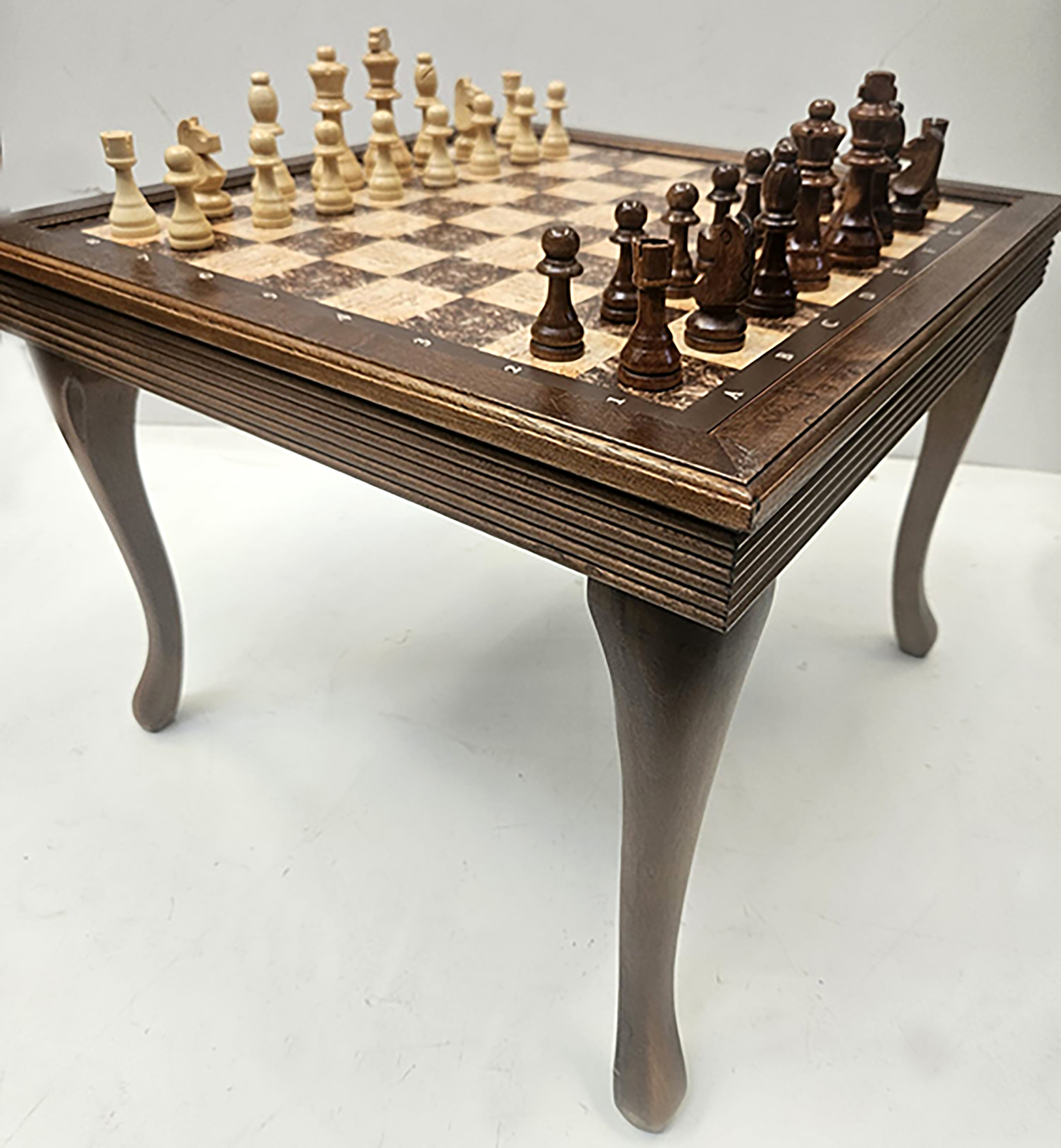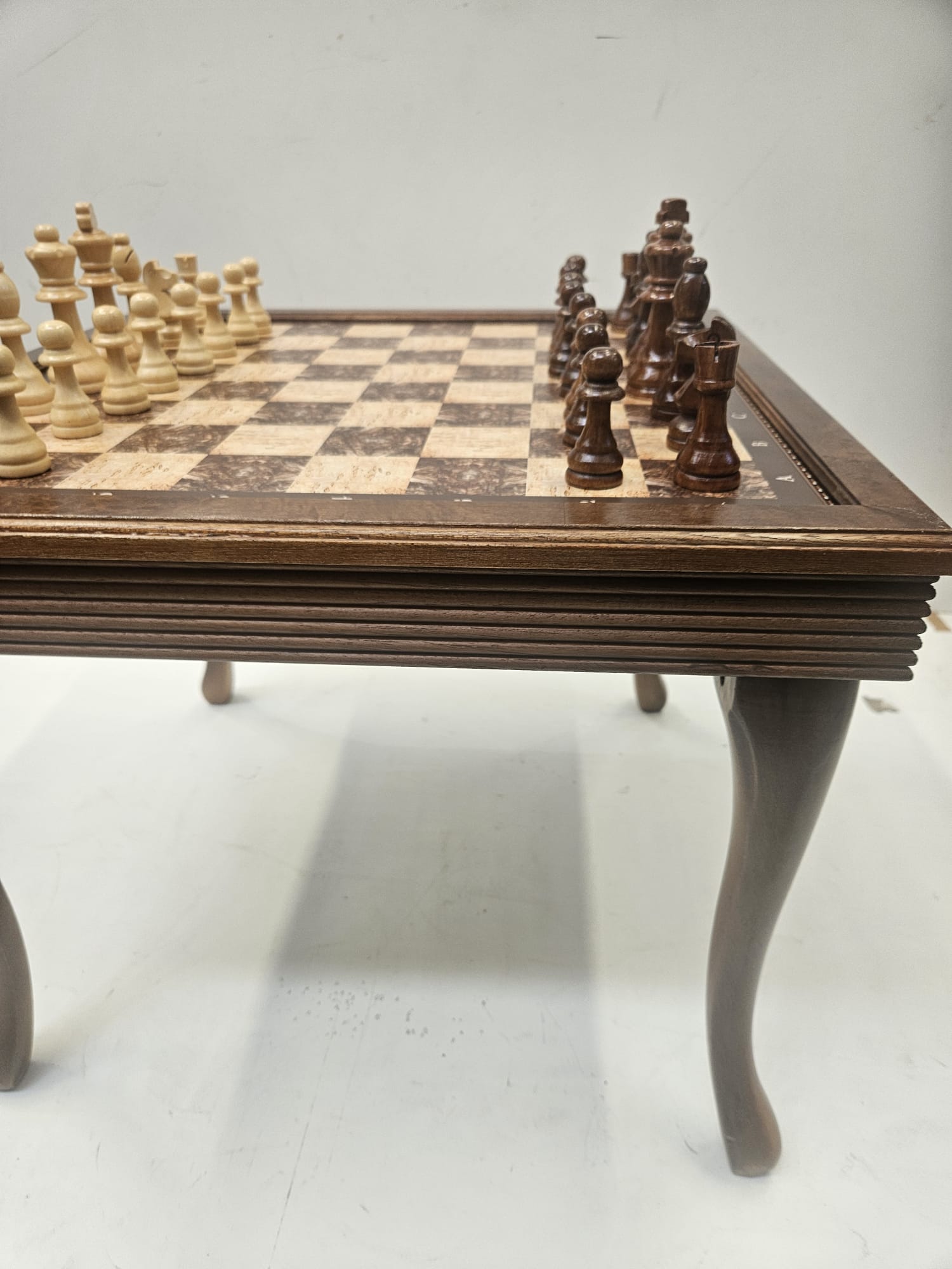 Tavolino in legno noce antico e cornice in radica cm 47x47x40, con gambe chippendale, compreso di scacchi in legno con Re alto cm 9.
