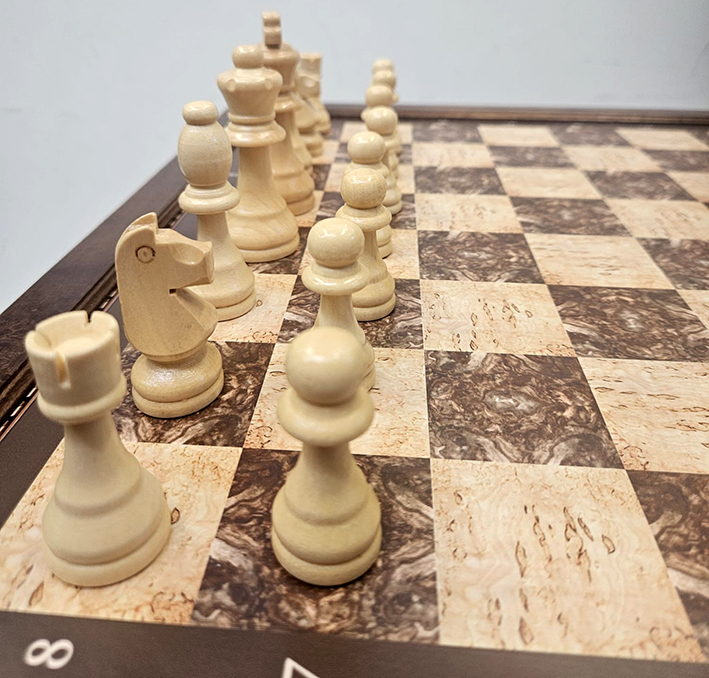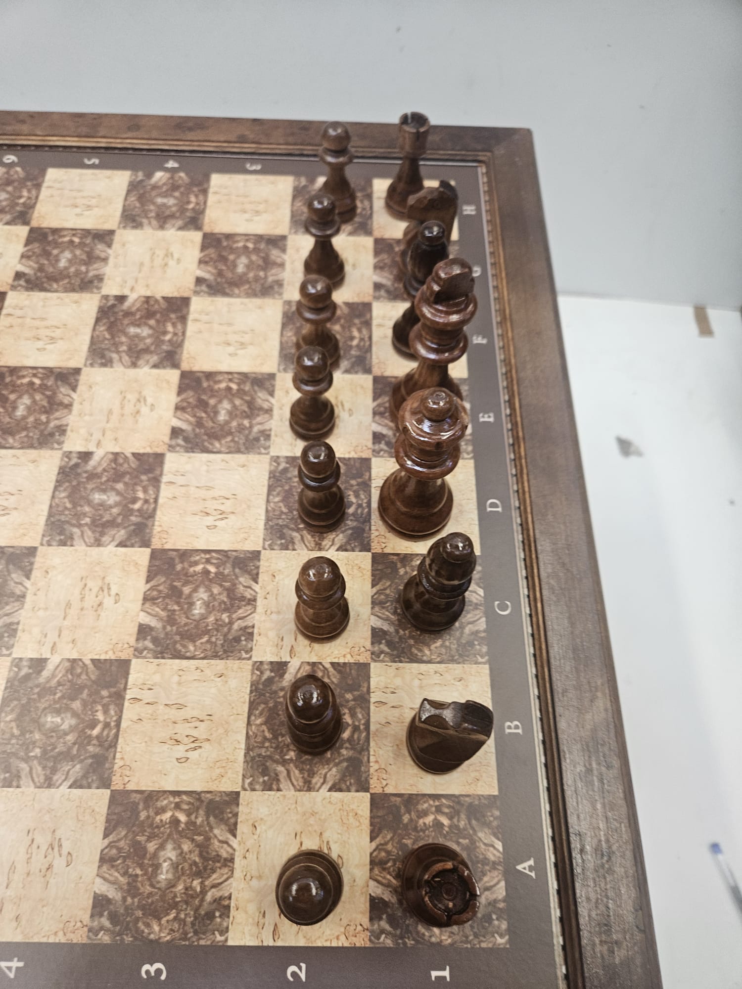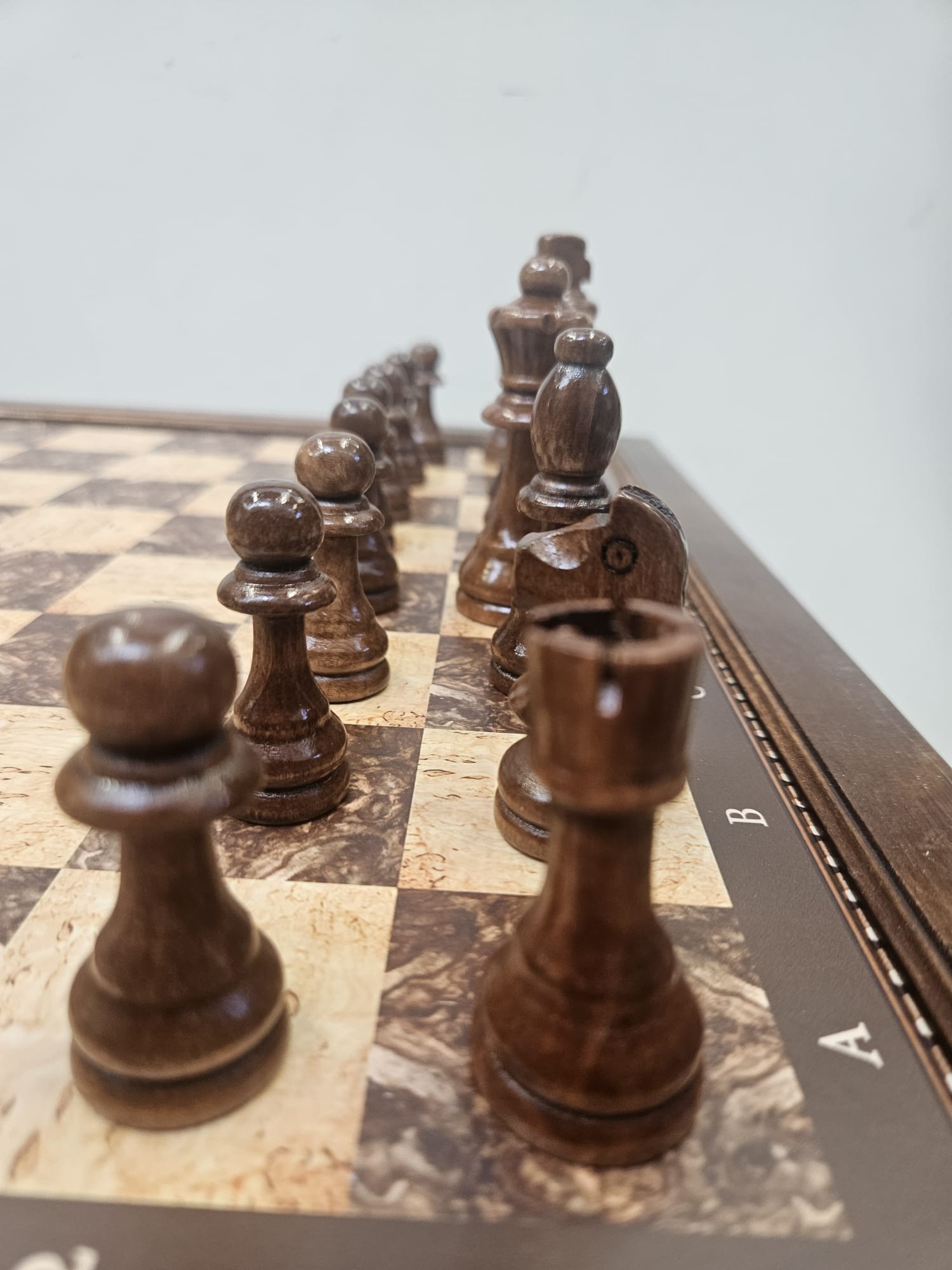 Tavolino in legno noce antico e cornice in radica cm 47x47x40, con gambe chippendale, compreso di scacchi in legno con Re alto cm 9.