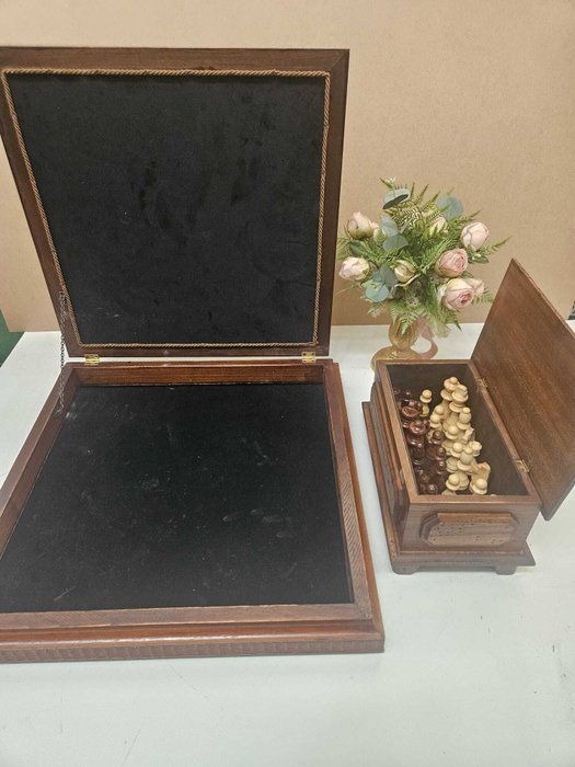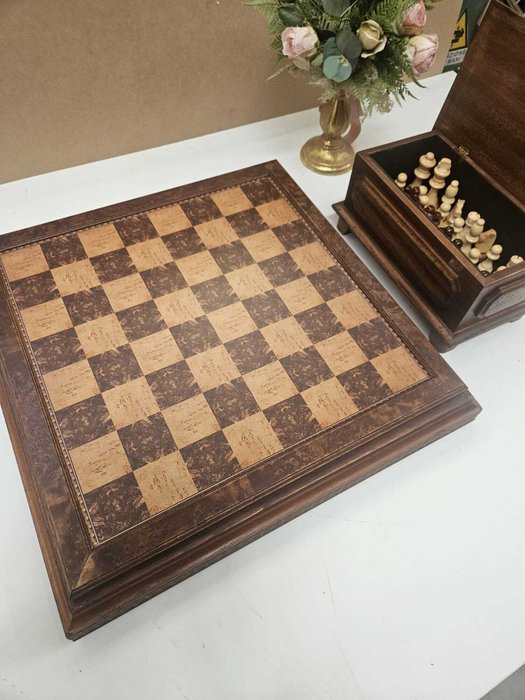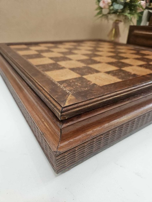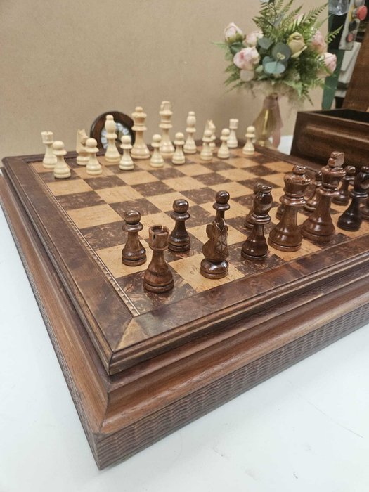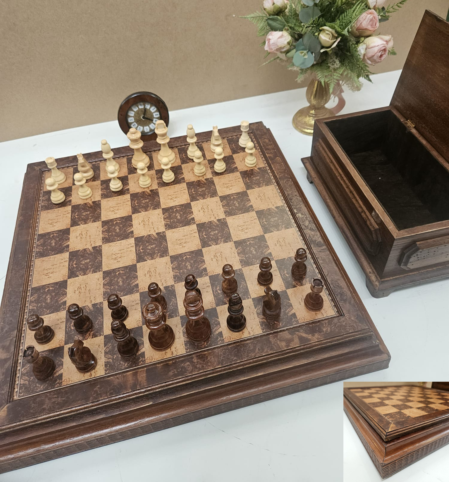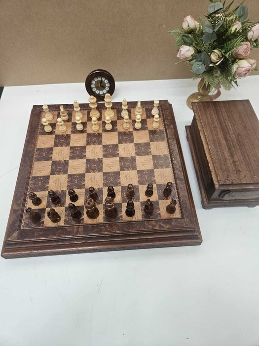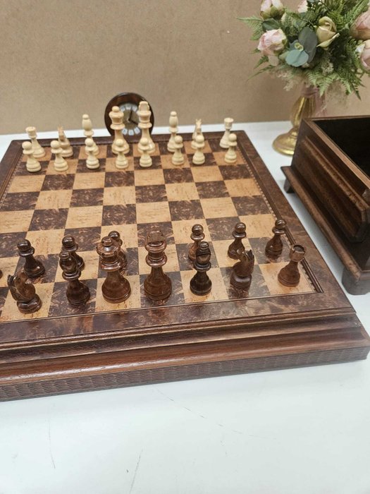 Scacchiera apribile in legno cm 52x52x7,5 misura esterna e cm 42x42 piano di gioco e cofanetto in legno colore noce cm 13x26x14, compreso di scacchi in legno con Re alto cm 9 e compreso di sveglietta in radica D. cm 12.