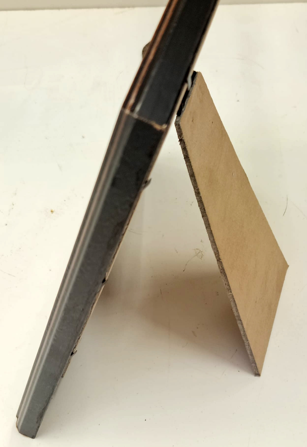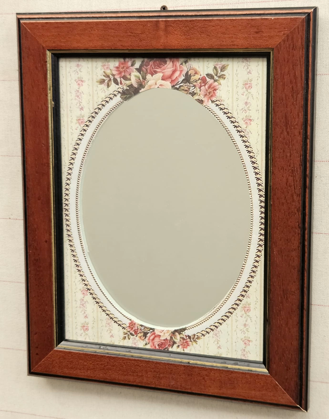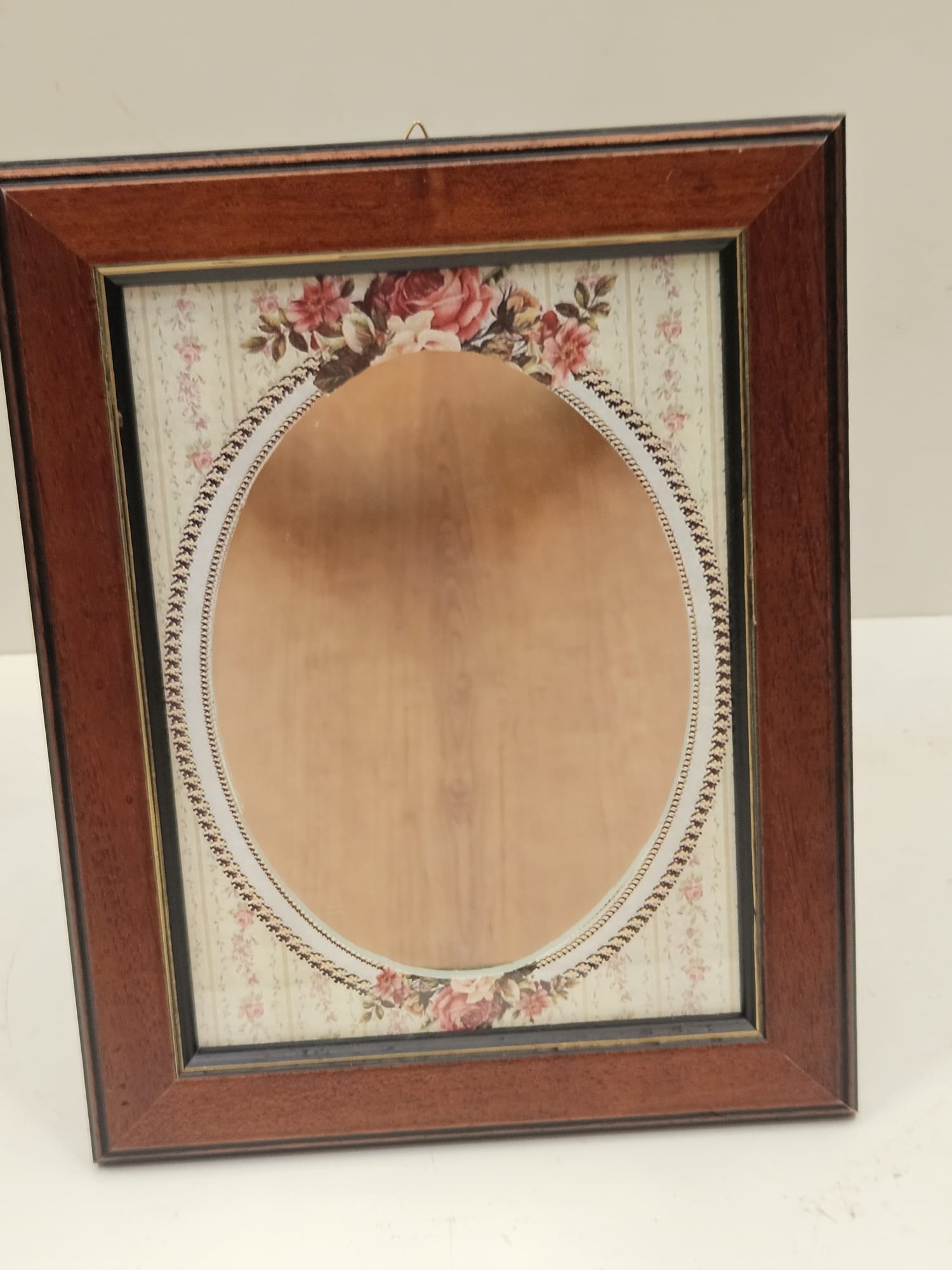 Specchio da parete e/o da appoggio con cornice in legno noce e filo oro con passepartout floreale, cm 18×24 misura interna.