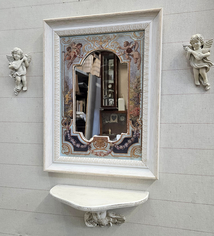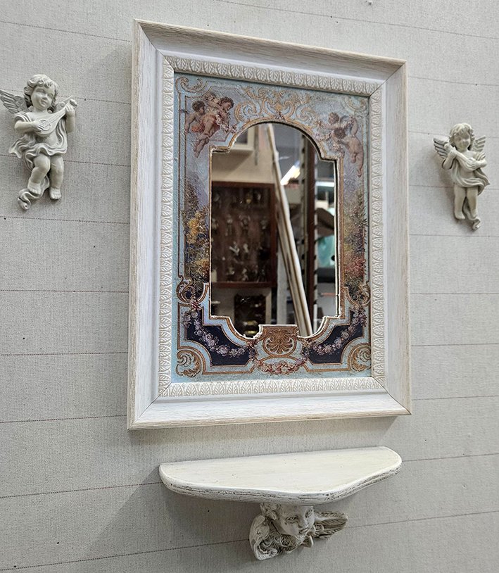 Completo composto da specchietto da parete in legno colore bianco provenzale con passepartout con angiolini, cm 20×25 misura specchio e cm 40×52 misura esterna, da coppia di puttini in resina e da mensolina in legno colore bianco provenzale cm 25×12.