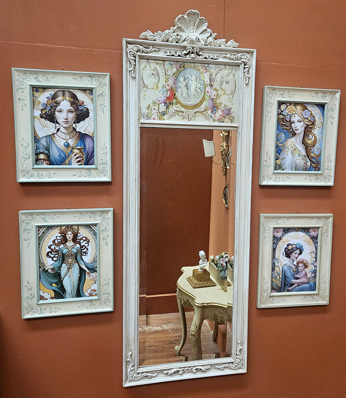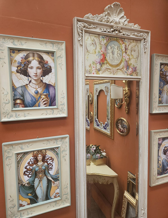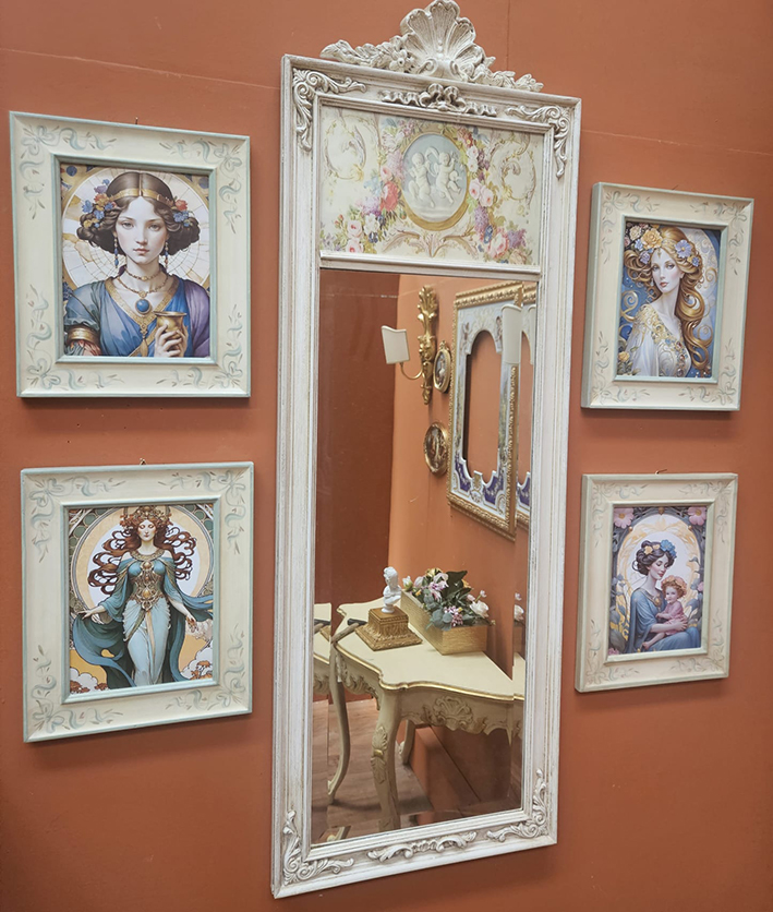Specchio da parete con stampa e specchio molato, con soggetto angiolini e floreale, cm 37×77 misura specchio e cm 40×110 misura esterna, più 4 quadretti con dame e cornici in legno decorate a mano.