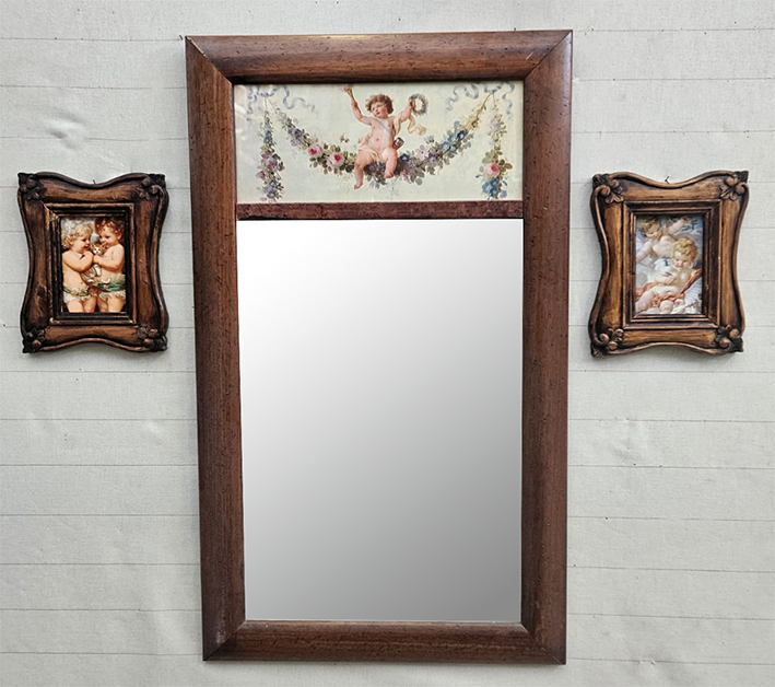Completo composto da specchio in legno con alzata floreale con puttino, cm 33x52 misura specchio e cm 42x74 misura esterna, e da 2 miniature cm 9x12 in cornici in legno intagliate a mano.
