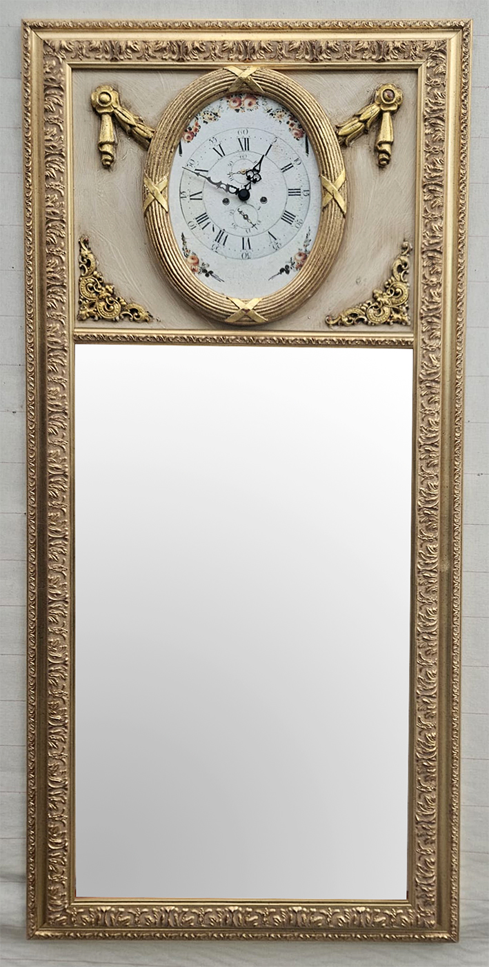 Specchio da parete con orologio nella parte superiore in cornice stile impero, in cornice in legno oro foglia cm 40×60 misura specchio e cm 53×110 misura esterna.