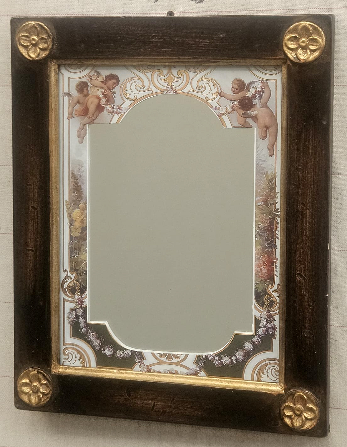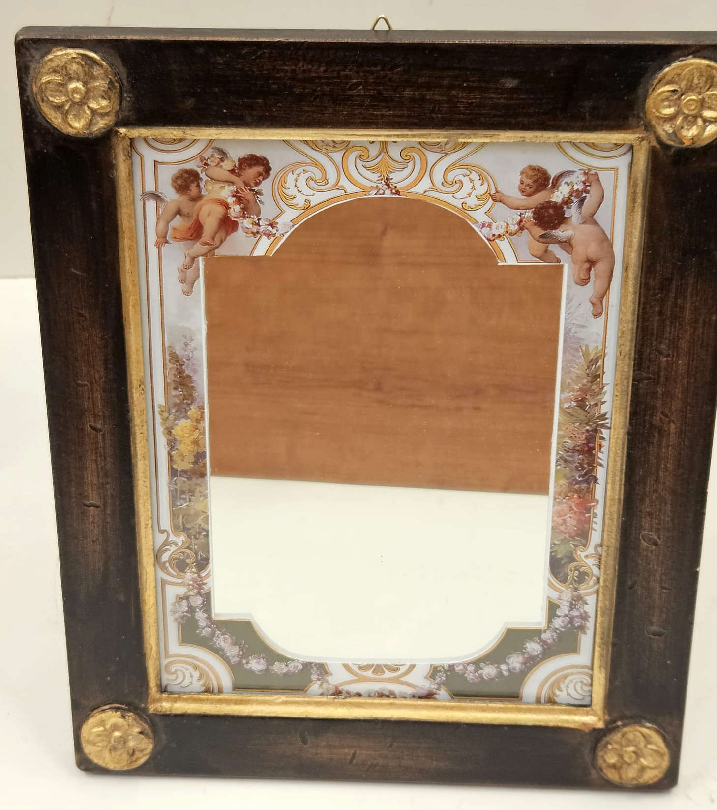Specchio da parete e/o da appoggio con cornice in legno con decori angoli oro e con passepartout con puttini, cm 18x24 misura interna.