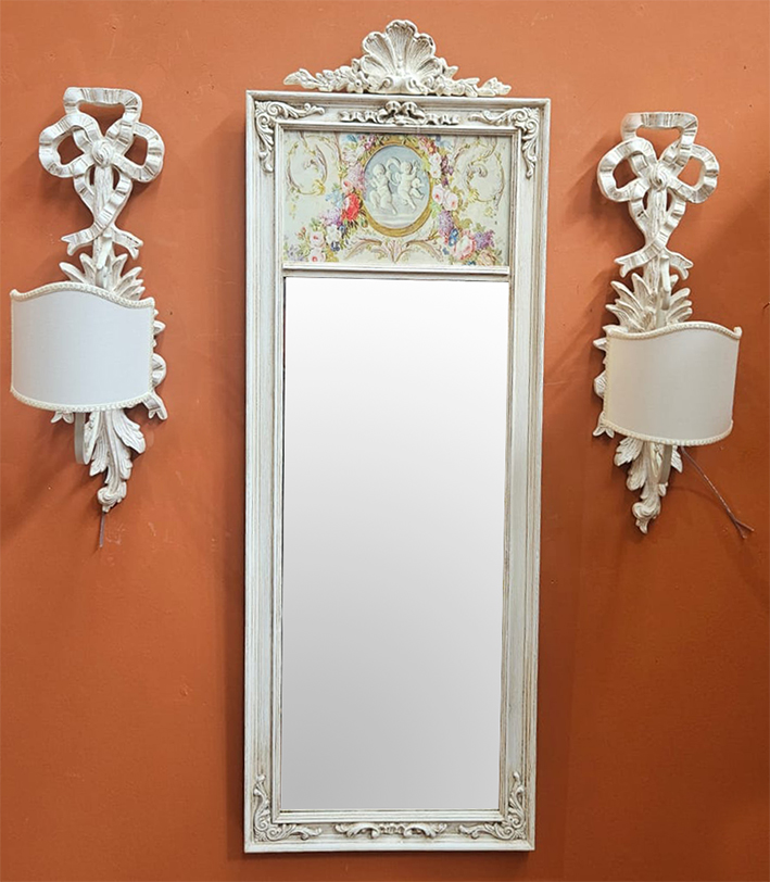 Completo composto da specchio in legno con cornice colore bianco provenzale e cresta, cm 32×79 misura specchio e cm 110×42 misura esterna, più due applique in legno con ventole.