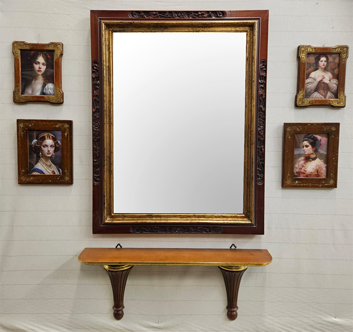 Completo da parete composto da specchio in legno pregiato teak intagliato a mano colore noce con bordo oro foglia, cm 50×70 misura interna, da 4 stampe di fanciulle italiane in cornici in legno intagliate a mano cm 13×18.